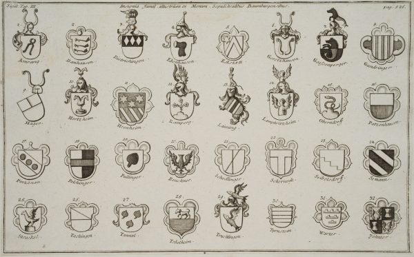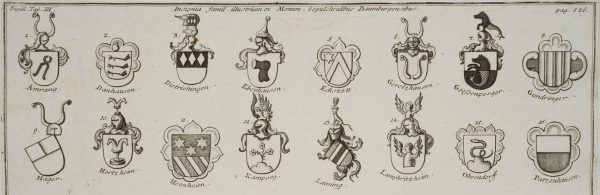 - Beschreibung: Das Blatt ist oberhalb betitelt mit: “Insignia famil. Illustrium ex Monum. Sepulchralibus Baumburgensibus” und links nummeriert mit “Sigill. Tab. III” und rechts mit “pag. 526.”. Darunter einer Liste mit beschrifteten Wappen: “Amrang, Danhausen, Dietrichingen, Ebenhausen, Eckstaett, Gerolzhausen, Goessenperger, Gundringen, Hager, Hertzheim, Hoenheim, Kamperg, Laiming, Lampritzheim, Oberndorff, Patzenhausen, Pinzenau, Pelchinger, Pullinger, Reuchner, Schedlinger, Schernegk, Seibolsdorff, Semann, Stoeckel, Tachingen, Tannel, Tobelheim, Truchtlingen, Tyrnstein, Warter, Zehnter”.