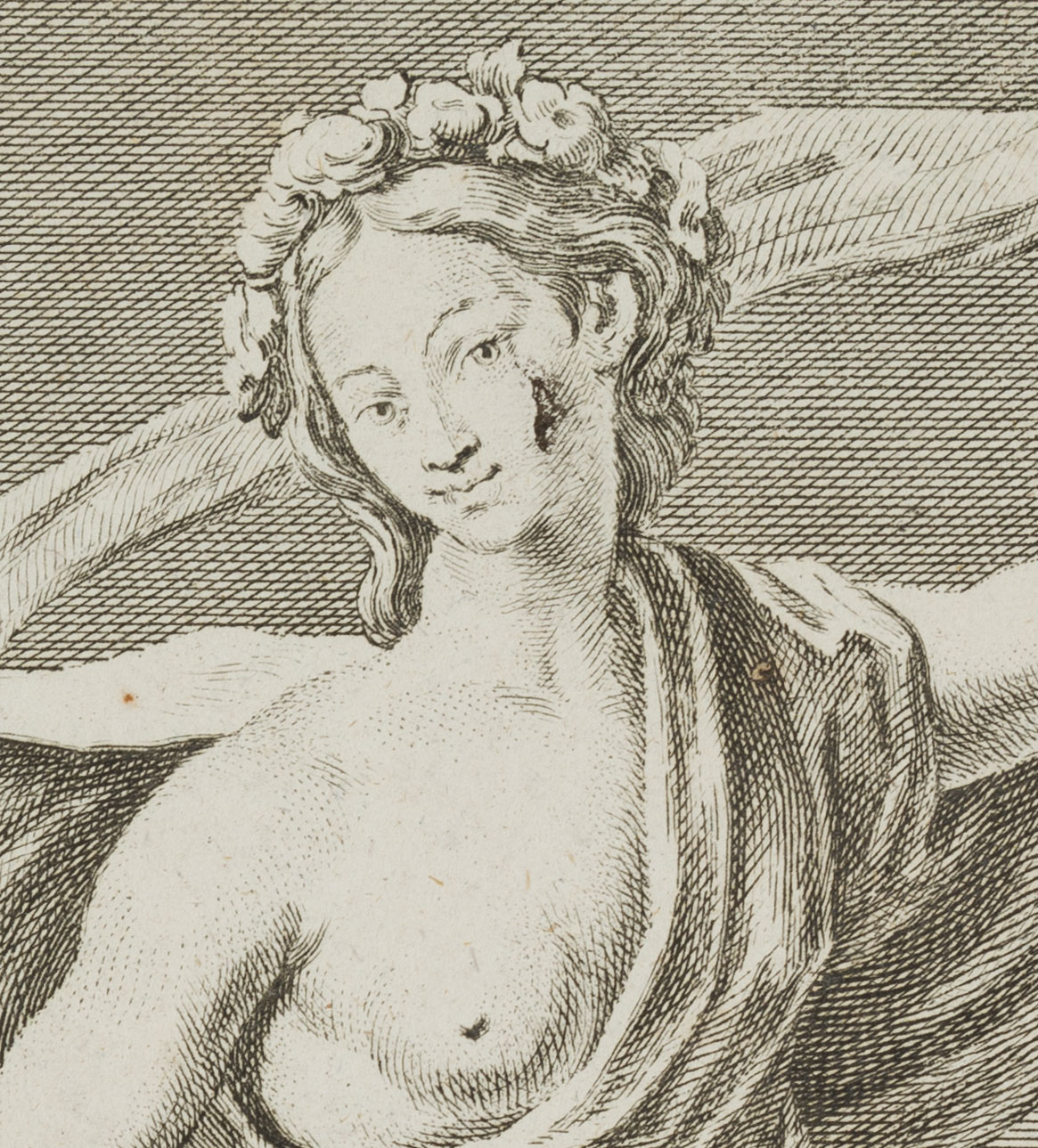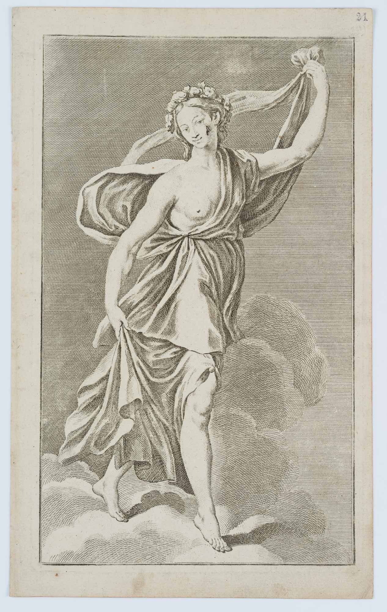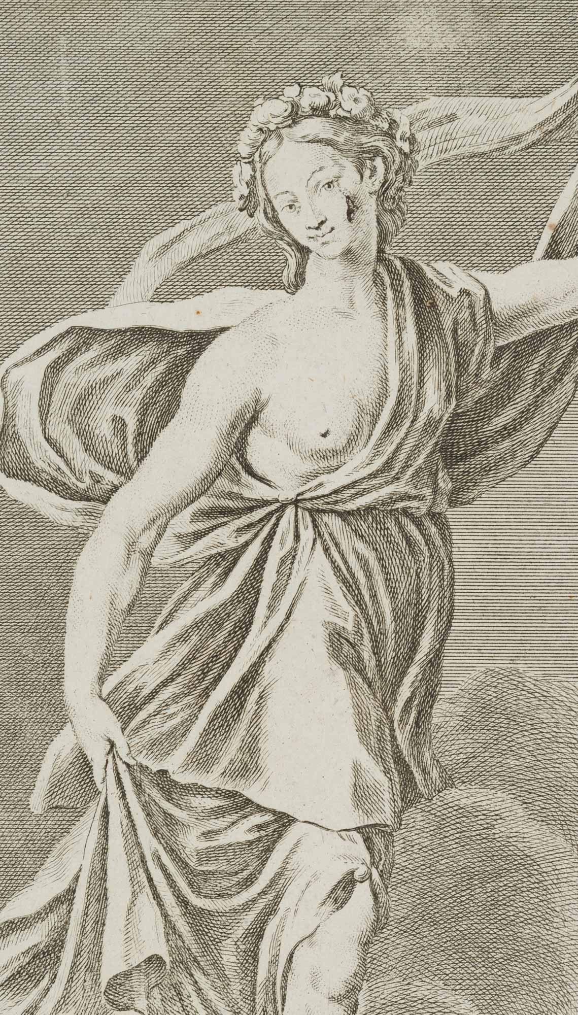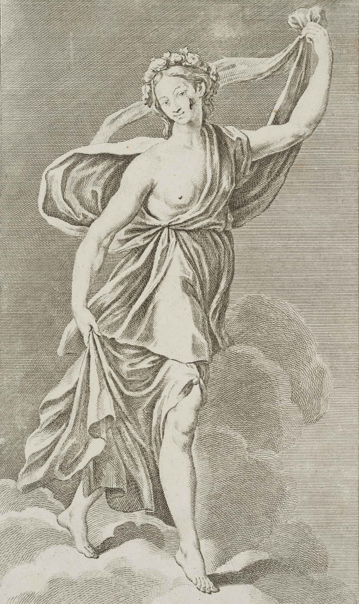 Unbekannt (18. Jahrhundert), Frauenfigur mit fallendem Gewand, Wolken, Blütenkranz, 18. Jahrhundert, Kupferstich