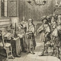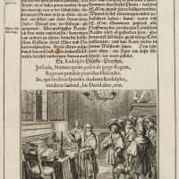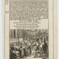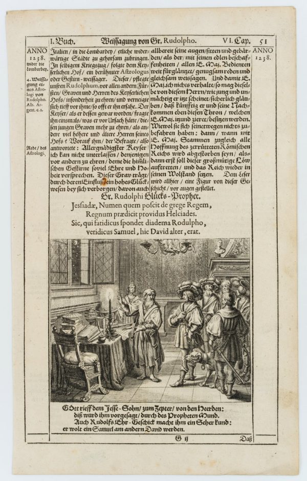 Kupferstich und beidseitiger typographischer Druck auf Papier. Aus dem Werk “Spiegel der Ehren des Höchstlöblichsten Kayser- und Königlichen Erzhauses Oesterreich oder Ausführliche Schrift von Desselben, und derer durch Erwählungs- Heurat- Erb- und Glücks-Fälle ihm zugewandter Kayserlichen Höchst Würde, Königreiche, Fürstentüm er, Graf- und Herrschaften, Erster Ankunft, Aufnahme, Fortstammung und hoher Befreundung mit Kayser- König- Chur- und Fürstlichen Häusern : auch von derer aus diesem Haus Erwählter Sechs Ersten Römischen Käysere.. Ihrer Nachkommen und Befreundten, Leben und Großthaten, mit Käys. Rudolphi I GeburtsJahr 1212 anfahend, und mit Käys. Maximiliani I TodesJahr 1519 sich endend” von Johann Jakob Fugger und Sigmund von Birken, das 1668 in Nürnberg veröffentlicht wurde. Daraus aus dem I. Buch, Weissagung von Gr. Rudolpho, VI. Kapitel, S. 51.