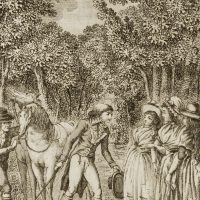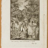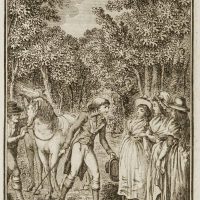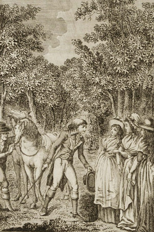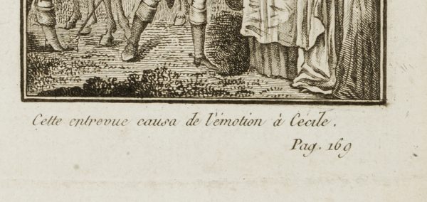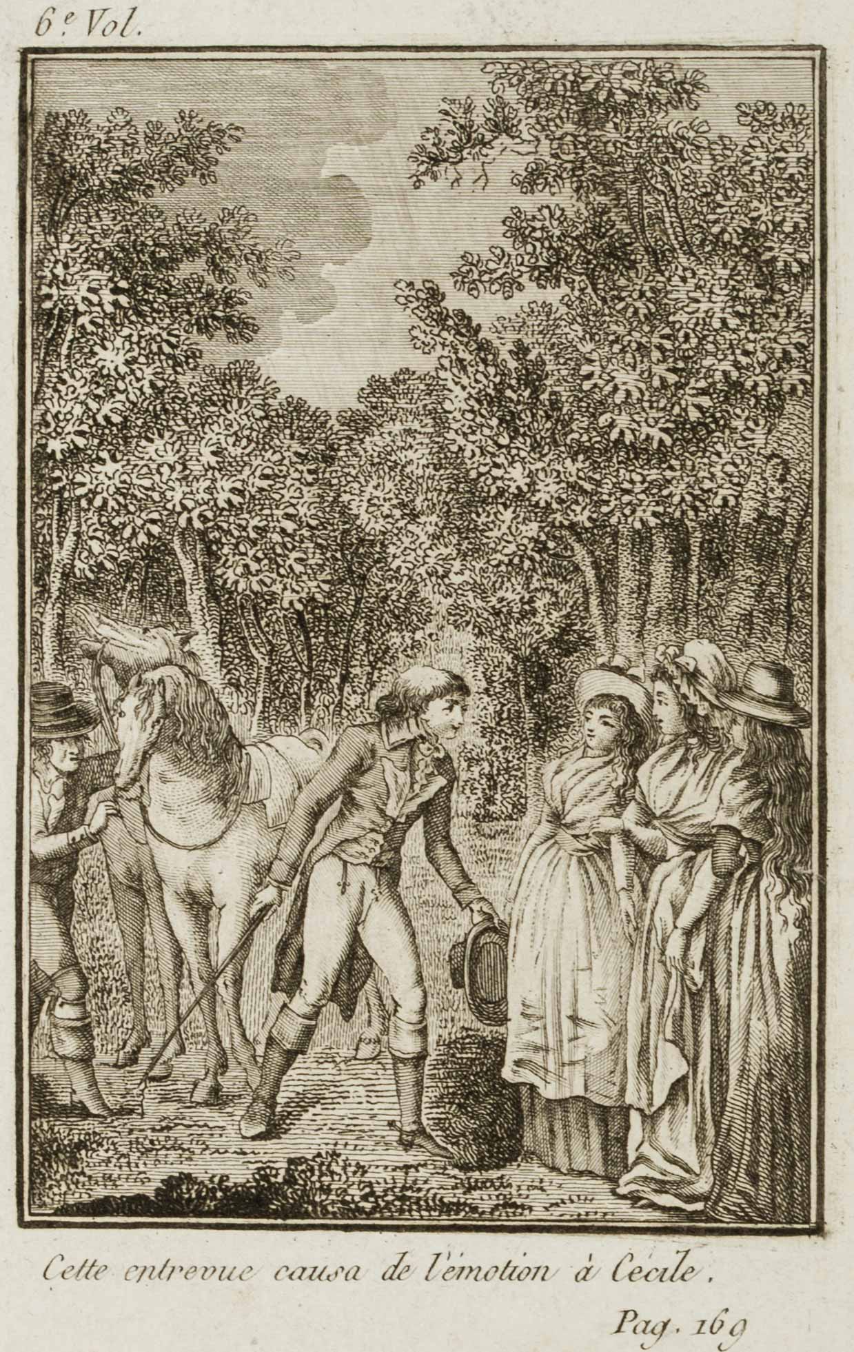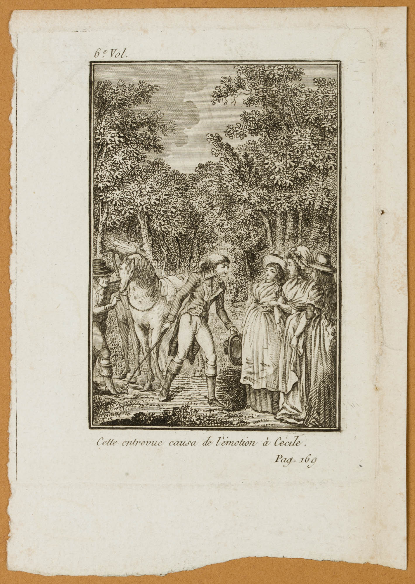 - Description: Three ladies meet two horsemen in the forest, The print is numbered “6.e Vol.” at upper left, below the caption: “Cette entrevue causa de l’émotion à Cecile. | Pag. 169”
