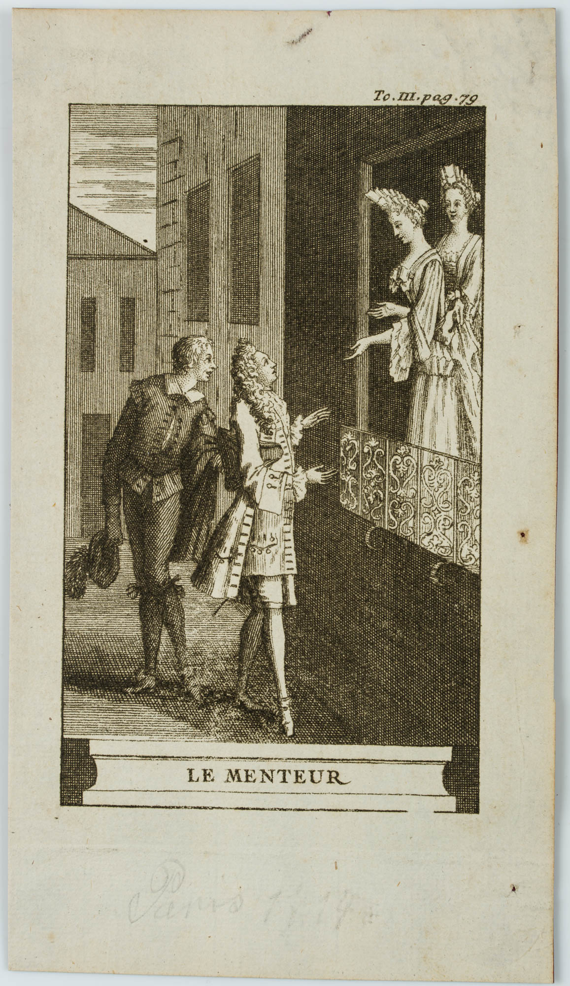- Inscription: Inscribed below with “LE MENTEUR”. Numbered above right with: “To. III. pag.79”