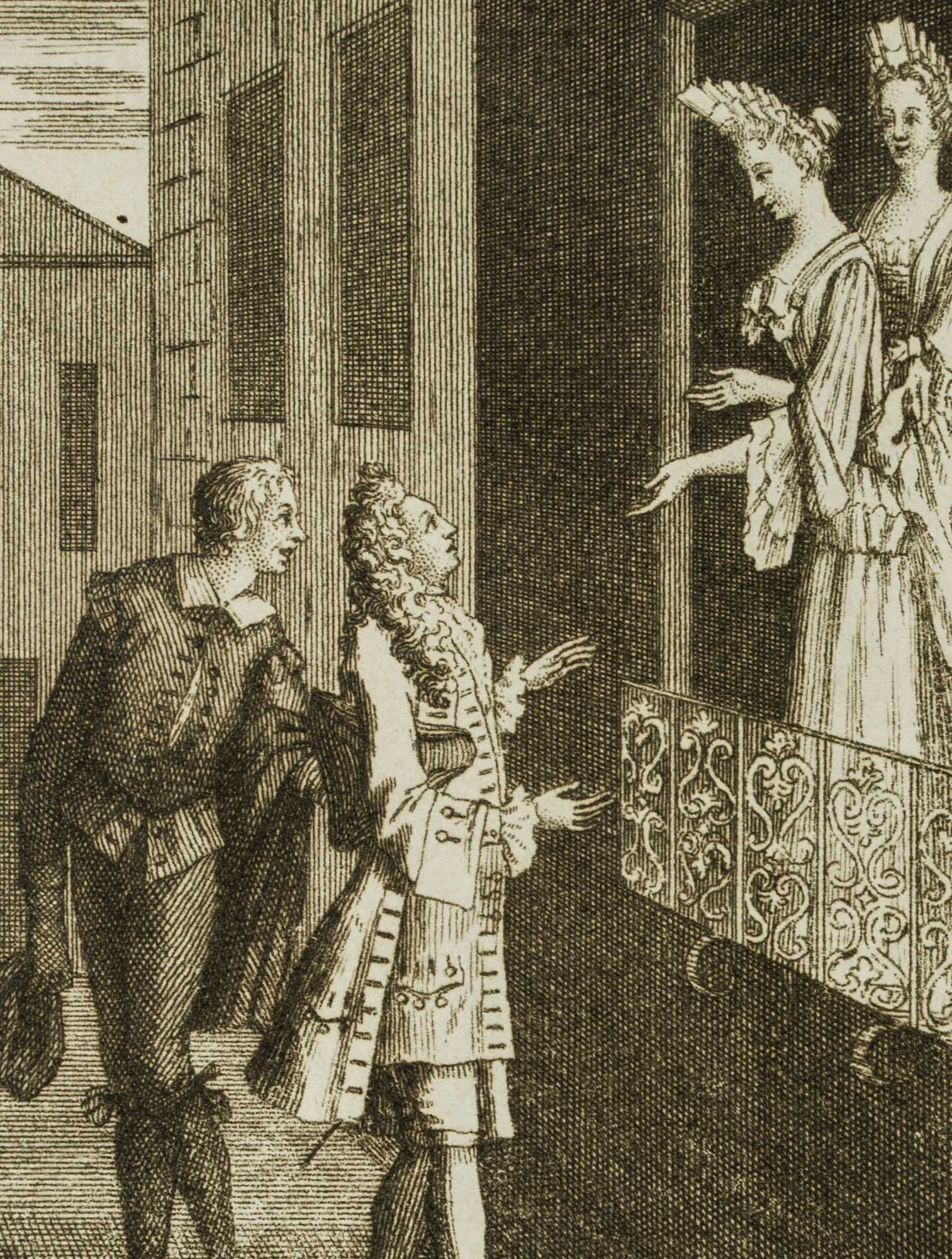 Unbekannt (18. Jahrhundert), Le Menteur (1644) von Pierre Corneille, literarische Illustration zur Komödie mit zwei jungen Edelleuten, die mit zwei Dirnen am Balkon ins Geschäft scheinen zu kommen, Paris, 1714, Kupferstich