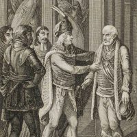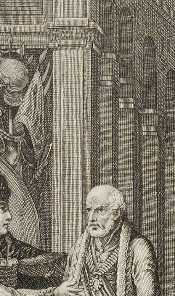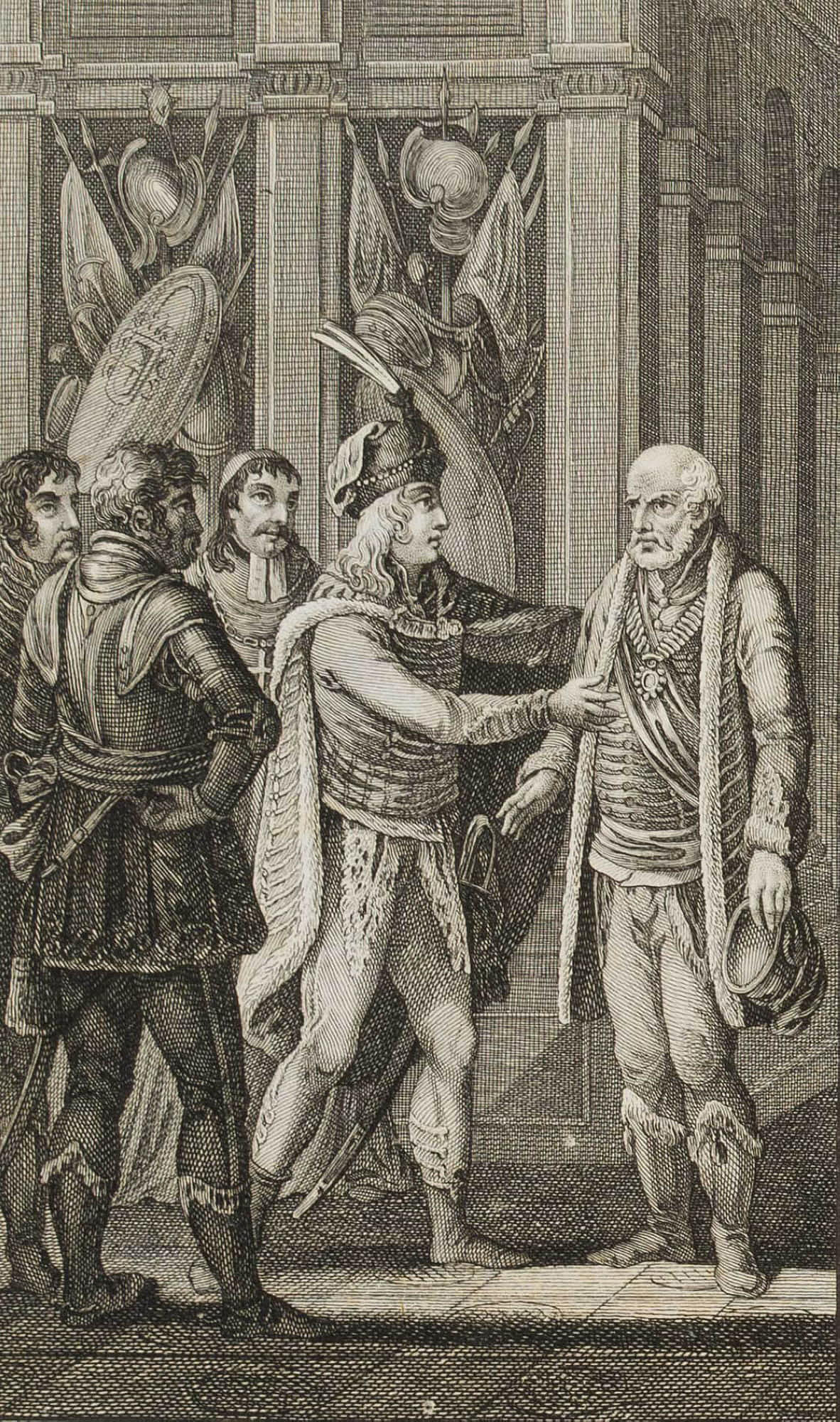 - Description: Several knights stand together in a representative hall. The youngest, wearing a cloak and a special headdress, respectfully welcomes an old man draped in medals.