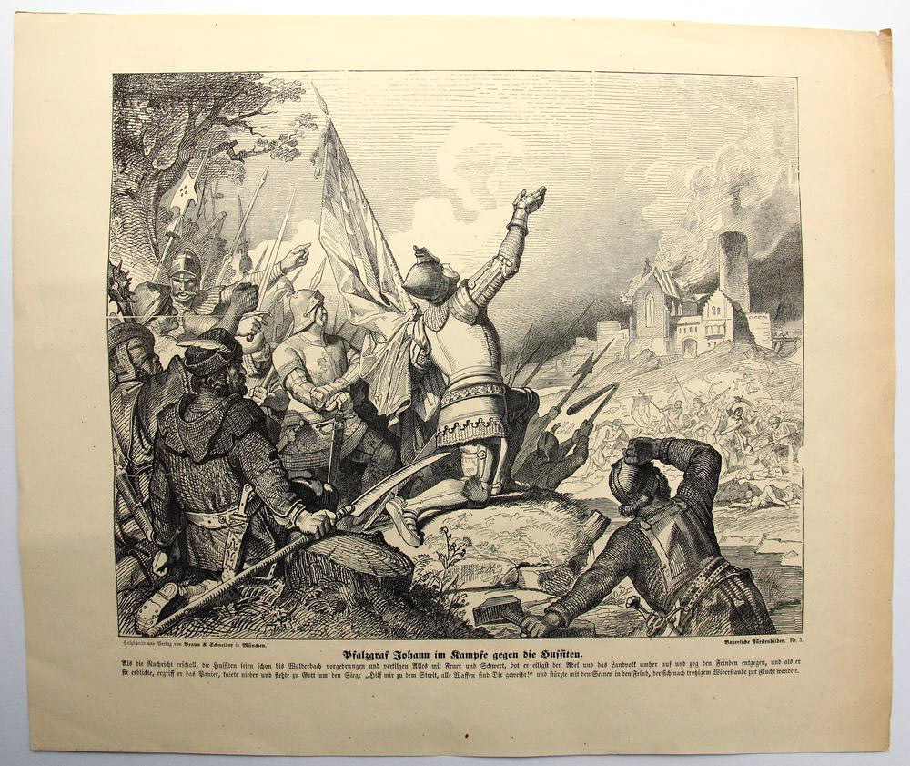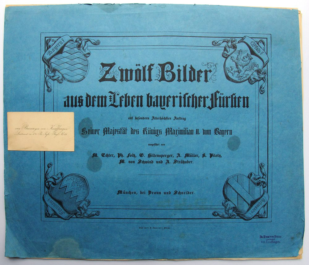- Description: Twelve woodcuts on paper in a blue paper folder. With the collaboration of the following artists: Michael Echter (1812 Munich – 1879 ibid.), Philipp von Foltz (1805 Bingen am Rhein – 1877 Munich), Georg Hiltensperger (1806 Haldenwang – 1890 Munich), Andreas Müller (1831 Stephans-Rettenberg – 1901 Munich), Karl Theodor von Piloty (1826 Munich – 1886 Ambach), Moritz von Schwind (1804 Vienna – 1871 Munich) and Alexander Straehuber (1814 Mondsee – 1882 Munich). Signatures and monograms of the respective artists can be found in the printing block of some of the depictions.