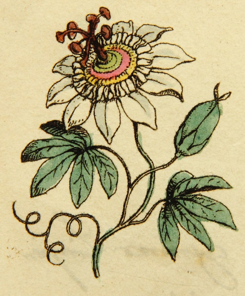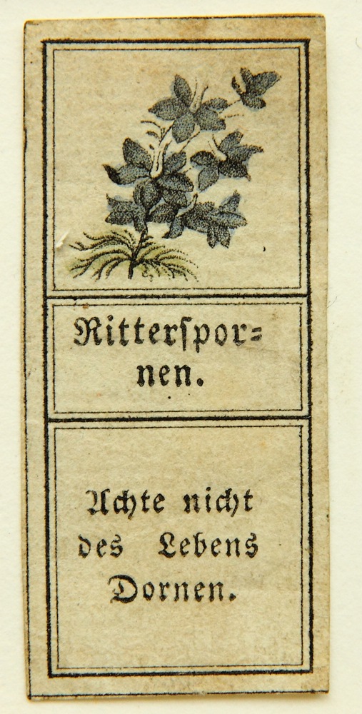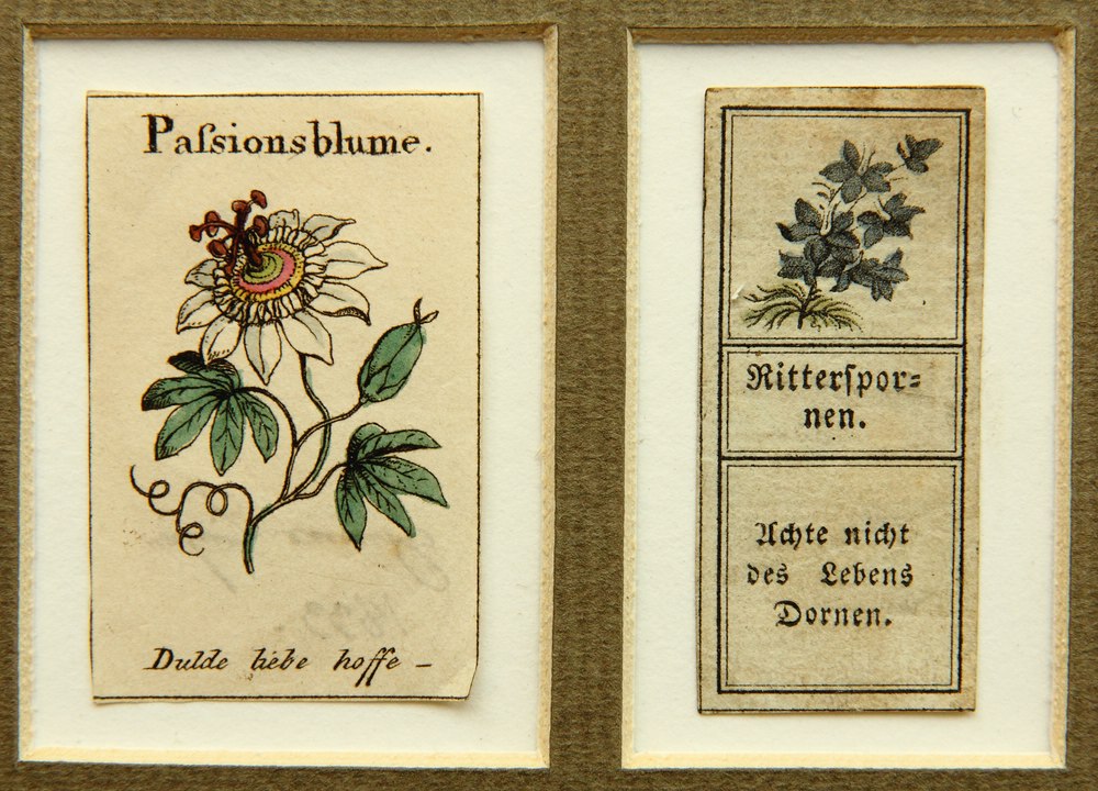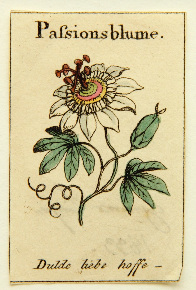 • Beschreibung: Zwei Grußkärtchen mit Sinnspruch, Blühende Passionsblume und blauer Rittersporn, 19. Jahrhundert, Kolorierte Radierung. Beschreibung:Zwei Kolorierte Radierung auf Papier. Unterhalb der ersten Darstellung befindet sich in der Druckplatte der Sinnspruch “Dulde liebe hoffe”, unter der zweiten “Achte nicht des Lebens Dornen”, jeweils mit Bezeichnung der Pflanzenart. Auf Blatt 1 befindet sich Rückseitig eine Signatur mit Feder und Tusche sowie eine Datierung auf 1833.