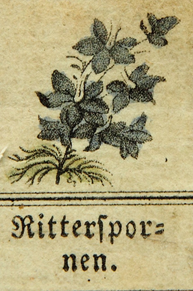 Zwei Grußkärtchen mit Sinnspruch, Blühende Passionsblume und blauer Rittersporn, 19. Jahrhundert, Kolorierte Radierung. Beschreibung:Zwei Kolorierte Radierung auf Papier. Unterhalb der ersten Darstellung befindet sich in der Druckplatte der Sinnspruch “Dulde liebe hoffe”, unter der zweiten “Achte nicht des Lebens Dornen”, jeweils mit Bezeichnung der Pflanzenart. Auf Blatt 1 befindet sich Rückseitig eine Signatur mit Feder und Tusche sowie eine Datierung auf 1833.