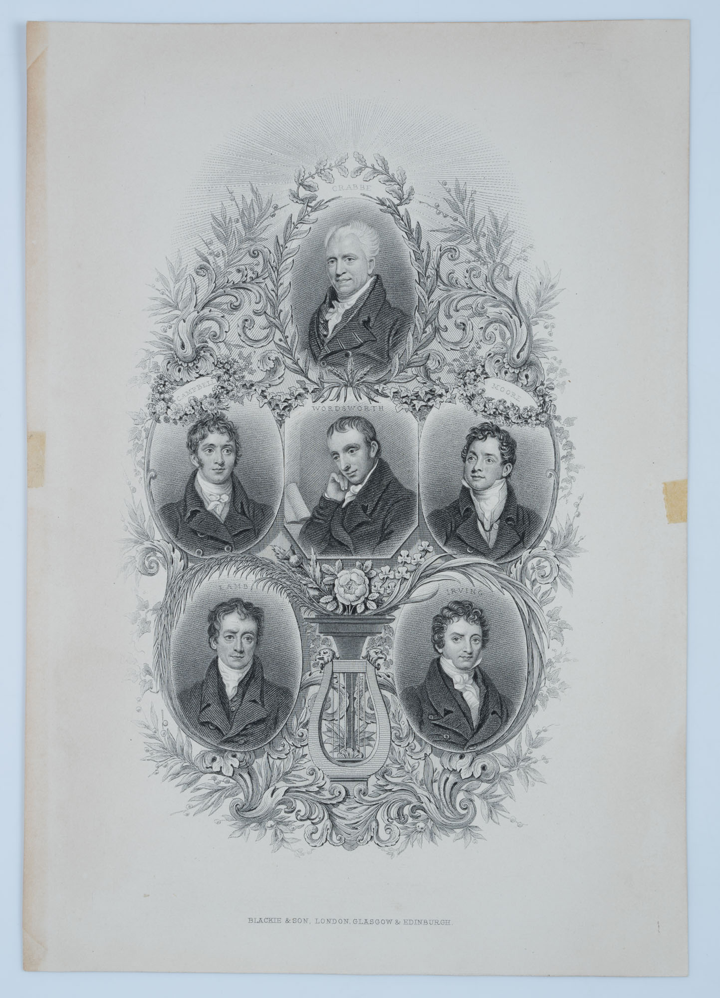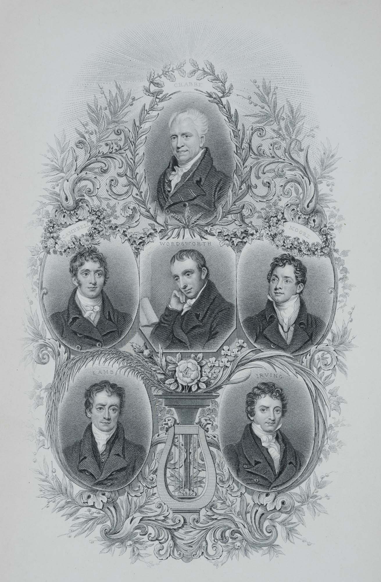 - Description: The sheet shows the following poets: George Crabbe, Thomas Campbell, William Wordsworth, Thomas Moore, Charles Lamb, Washington Irving (American).