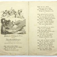 - Beschreibung: Illustration zum Feenspiel “Der Zauberschleier” mit jungem Mädchen im weißen Kleid in einer Hügellandschaft. Über ihr schweben fünf anmutige Feen. Darunter und daneben sind die ersten vier Strophen in Versen abgedruckt.