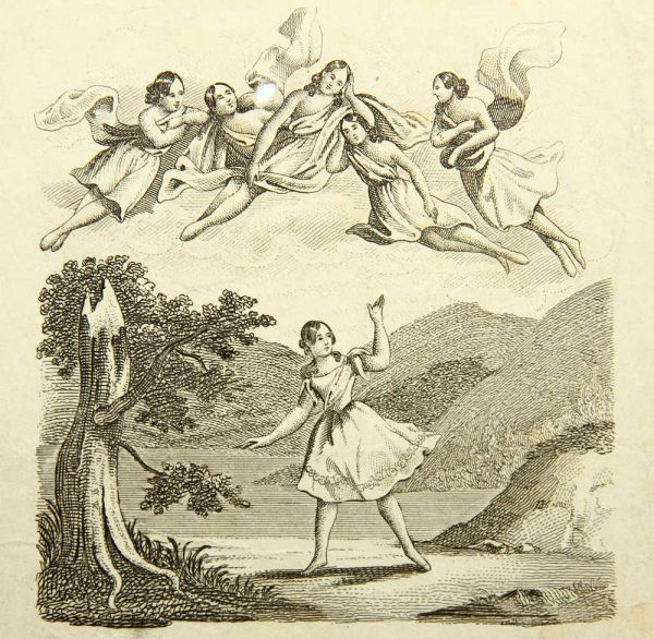 - Description: Illustration of the fairy play “The Magic Veil” with young girl in white dress in a hilly landscape. Above her float five graceful fairies. Below and next to it are printed the first four stanzas in verse.