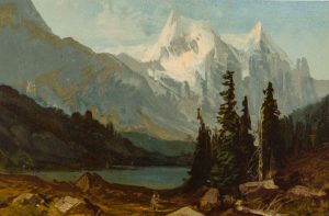 - Description: The view leads from a water mill on a river over tall fir trees to a monumental mountain backdrop in the distance.