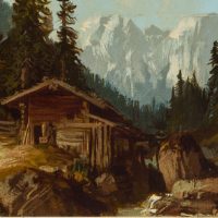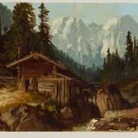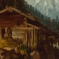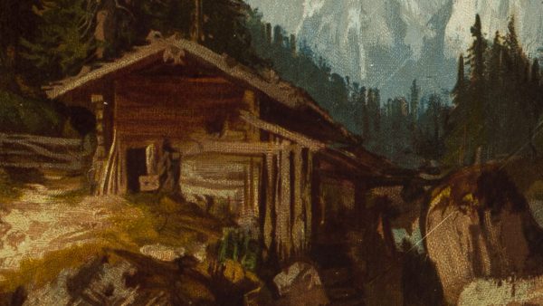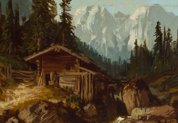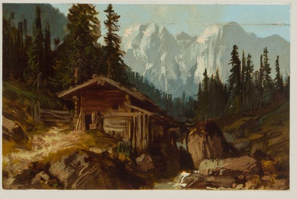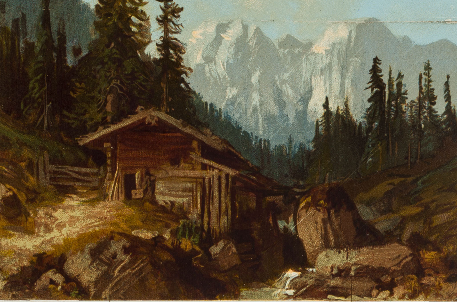 Unknown (19th century), Wild alpine landscape with a view of a water mill on a river in a sparse fir forest against a mighty mountain backdrop in the distance, c. 1900, Oleograph