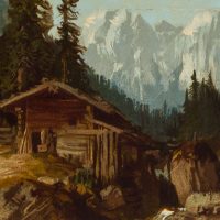 Unbekannt (19. Jahrhundert), Wilde alpine Landschaft mit Blick auf eine Wassermühle an einem Fluss in einem lichten Tannenwald vor einer gewaltigen Gebirgskulisse in der Ferne, um 1900, Öldruck