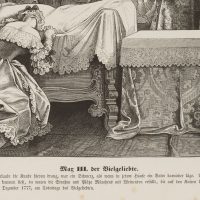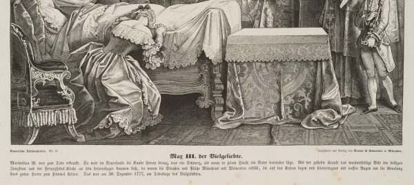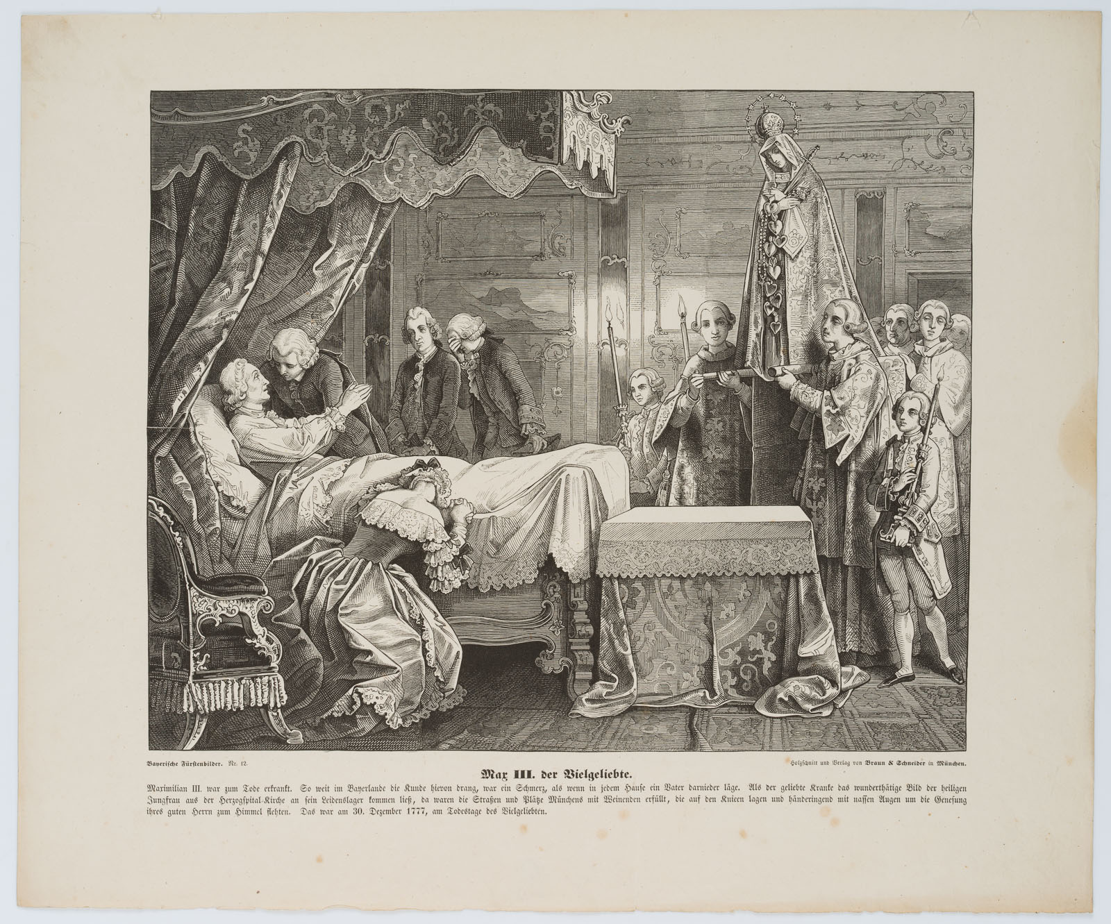 Unbekannt (19. Jahrhundert), Historiendarstellung. Am Sterbebett des Maximilians III. 30. Dezember 1777 (1727 in München – 1777 in München), aus der Reihe: Bayerische Fürstenbilder Nr. 12, 19. Jahrhundert, Holzstich