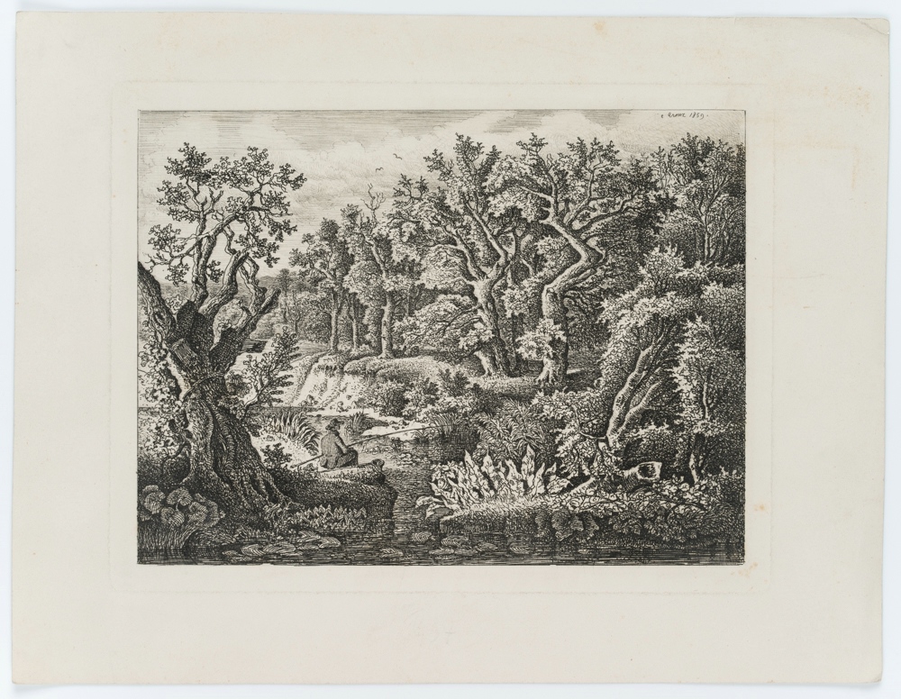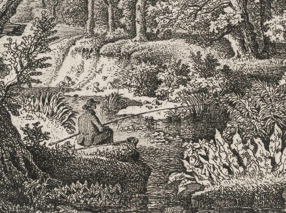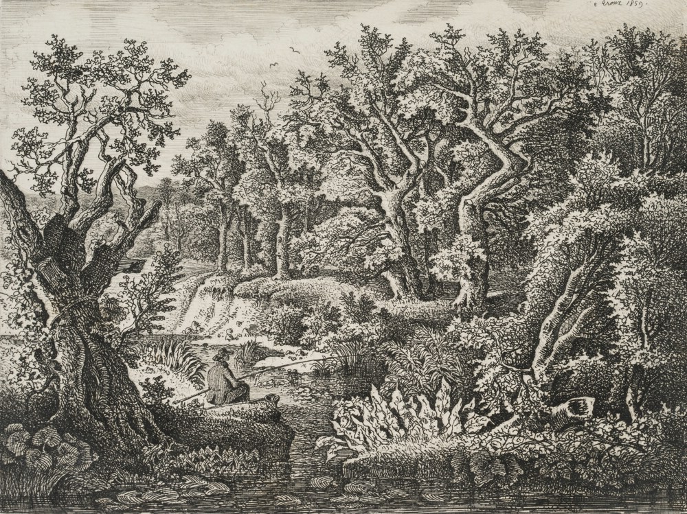 Unknown (19th century), Anglers by the river near old-growth forest, 1859, Etching