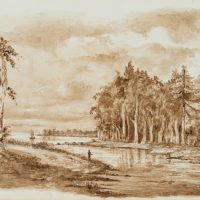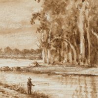 - Description: Idyllic landscape depiction in Flemish or Dutch surroundings. A lonely angler stands by a slowly flowing body of water surrounded by dense trees.