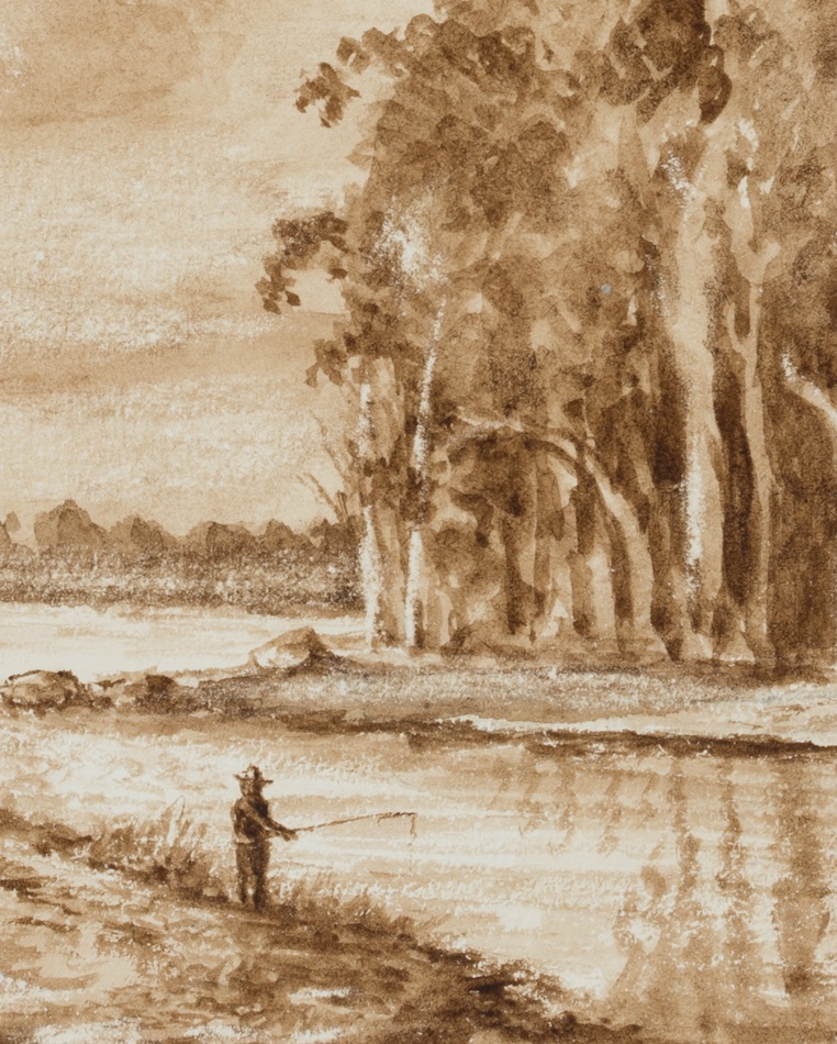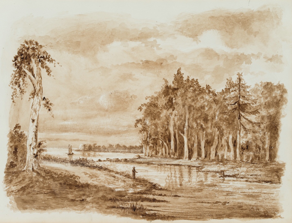 Unbekannt (19. Jahrhundert), Angler in Waldstück in holländischer Landschaft, 19. Jahrhundert, Pinselzeichnung