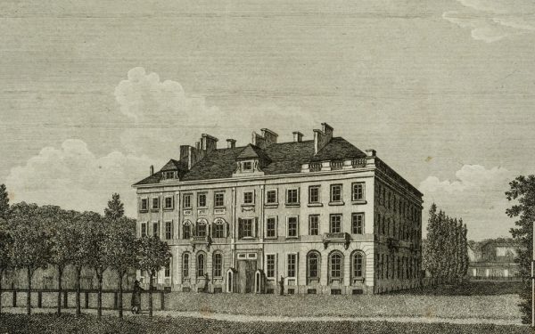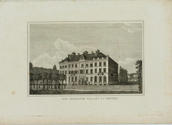 - Beschreibung: ohne Bezeichnung, betitelt “Der königliche Pallast zu Brüssel”. An der Stelle des heutigen königlichen Residenz des belgischen Königs stand einst eine kleinere Residenz, welche in der Darstellung abgebildet ist. Umgeben von einer Parklandschaft bietet der Palast eine pittoreske Ansicht, die ebenso einen Spazierenden zum verweilen eingeladen hat.