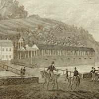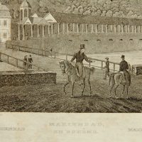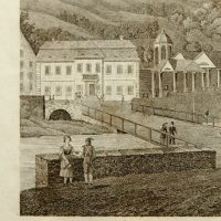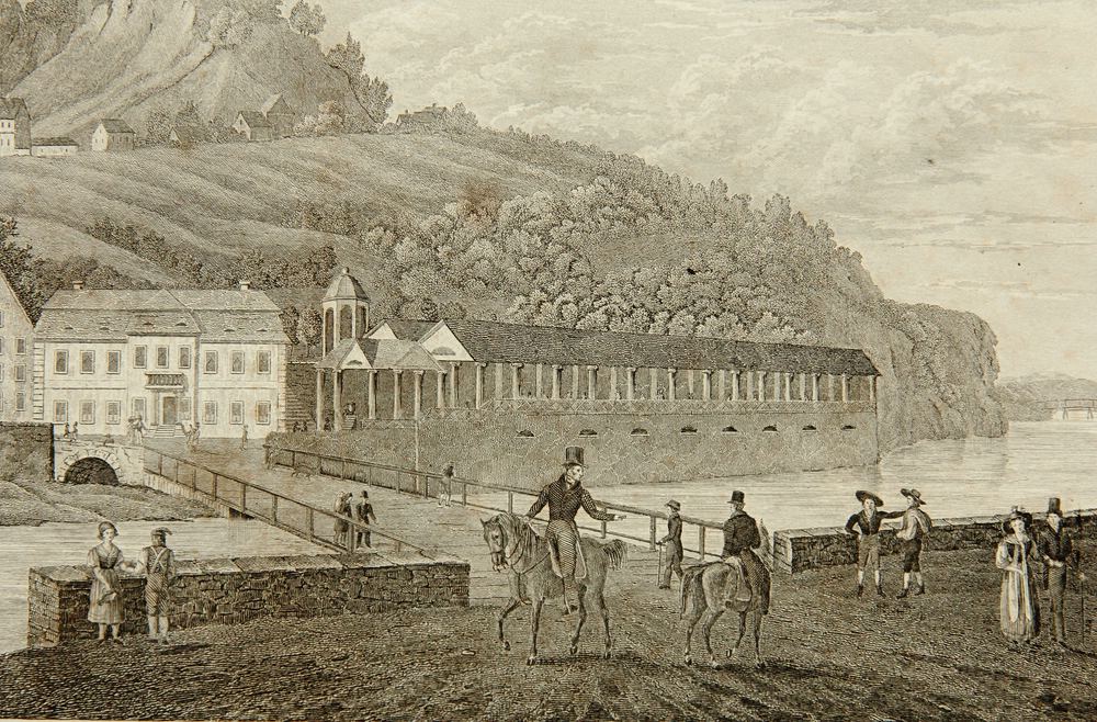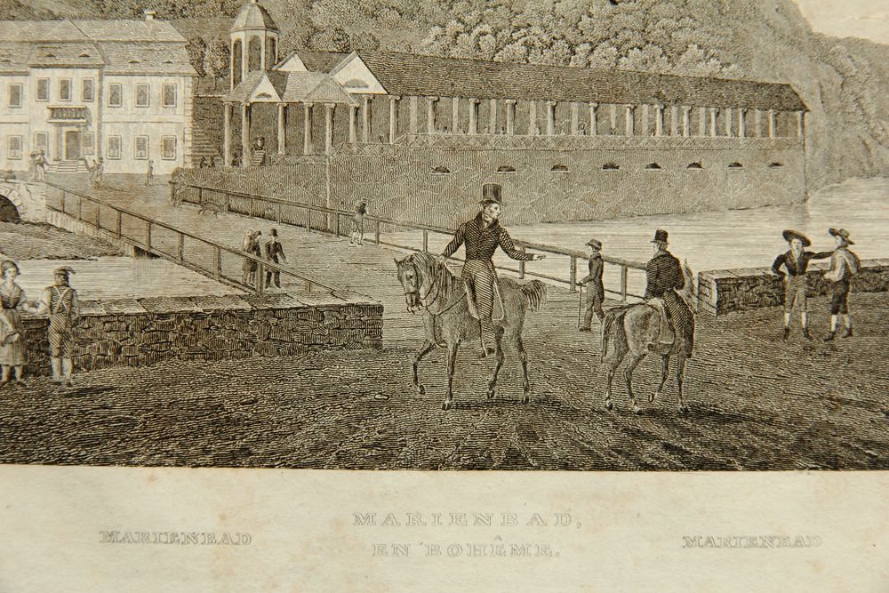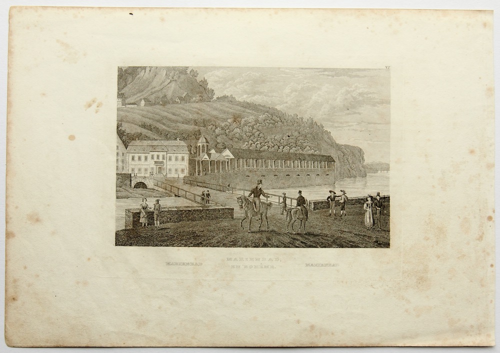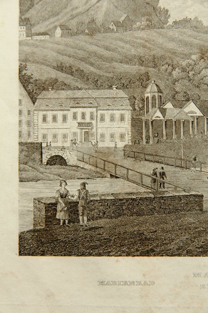 - Description: View of the spa town with healing springs Marienbad (Marinsk Lzne) in the Czech Republic, bridge with view of the colonnade on the shore and strolling spa guests, about 1840, steel engraving. Description:Steel engraving on paper. Titled in German and French below the image in the printing plate.