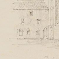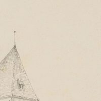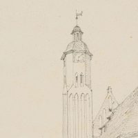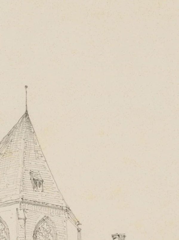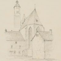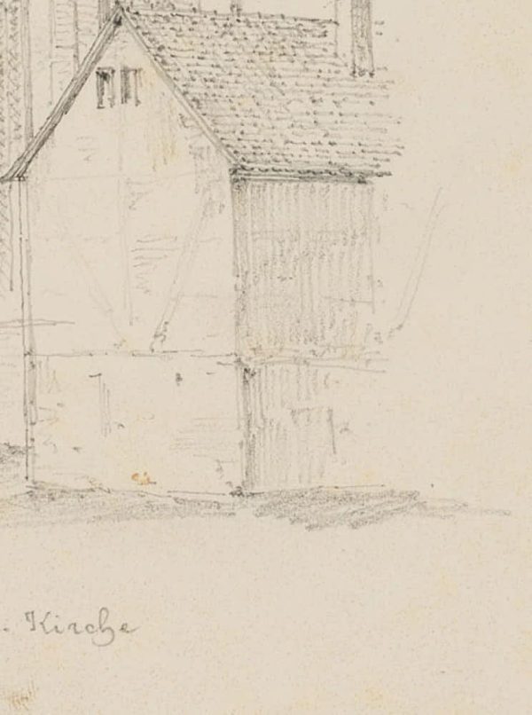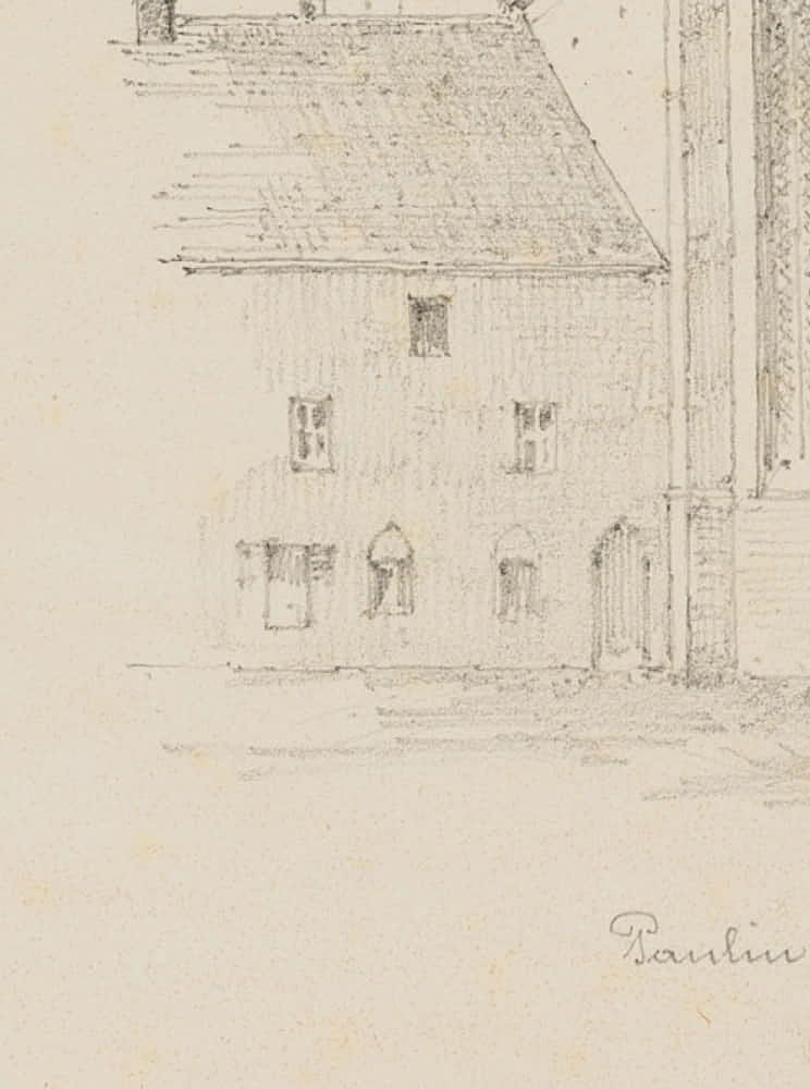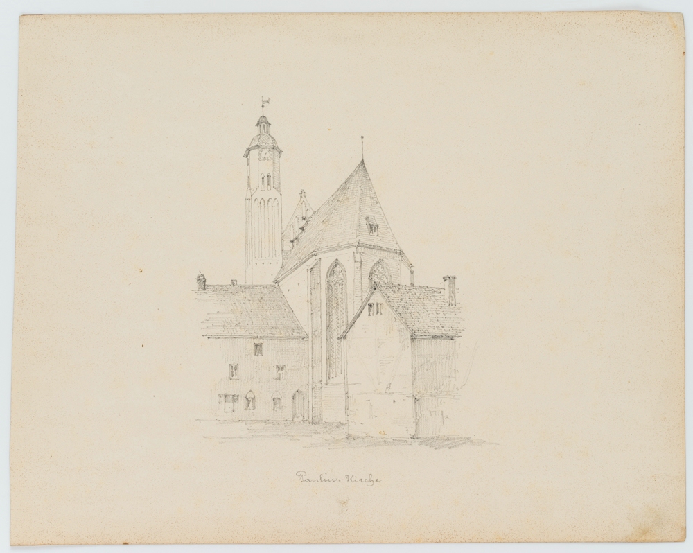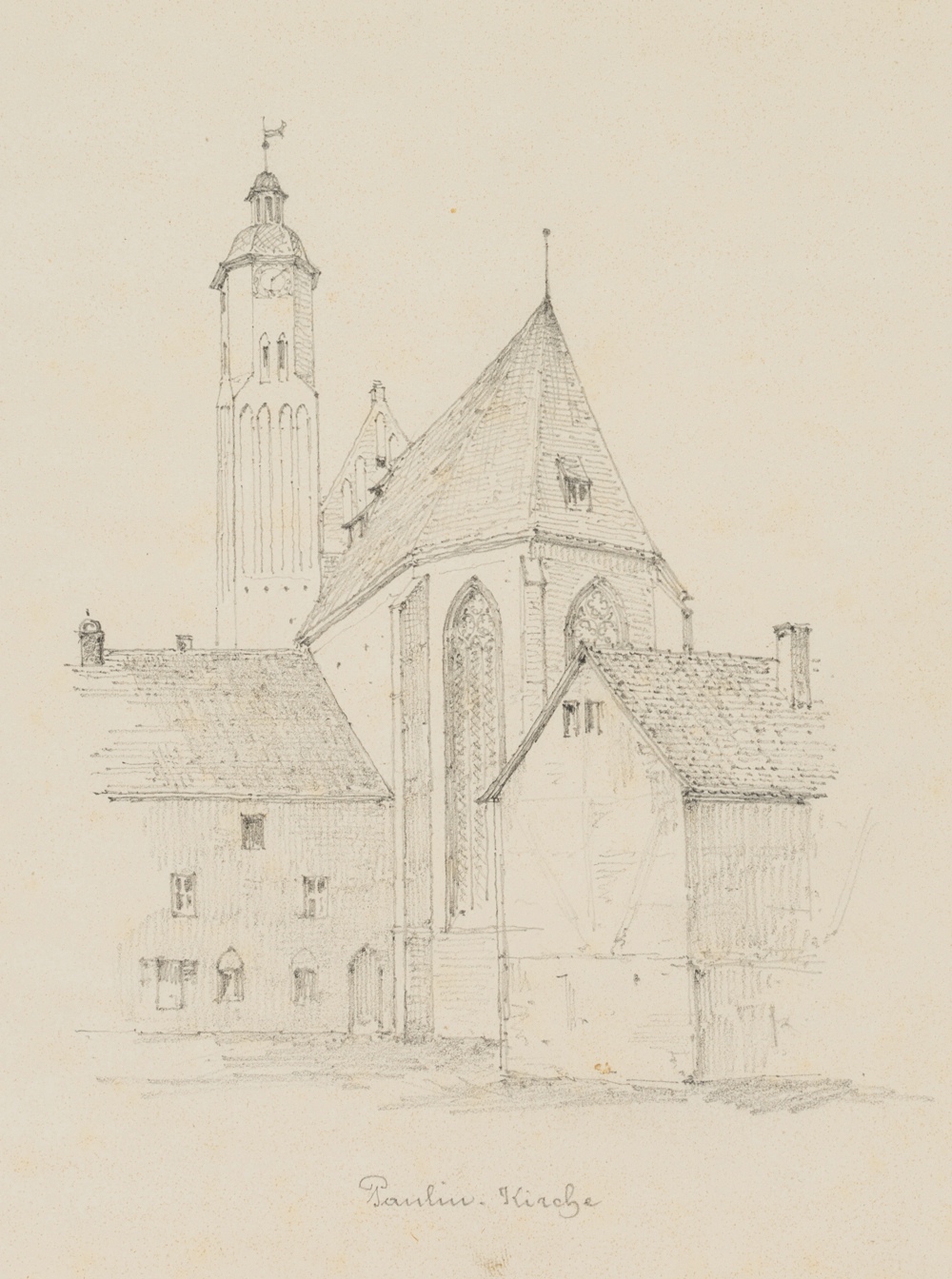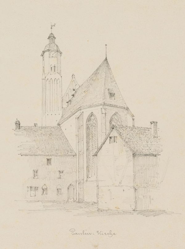 - Description: Successful view of a Gothic church with a high choir and a slender west tower. The closely adjoining buildings are reminiscent of monastery buildings. Despite the exact designation with the patrocinium of St. Paulin or St. Paulinus, the church cannot be precisely located. The freestanding gable projecting over the ridge of the roof is reminiscent of the brick Gothic style of northern Germany. The drawing is from the sketchbook of an anonymous travelling artist from the late 19th century.