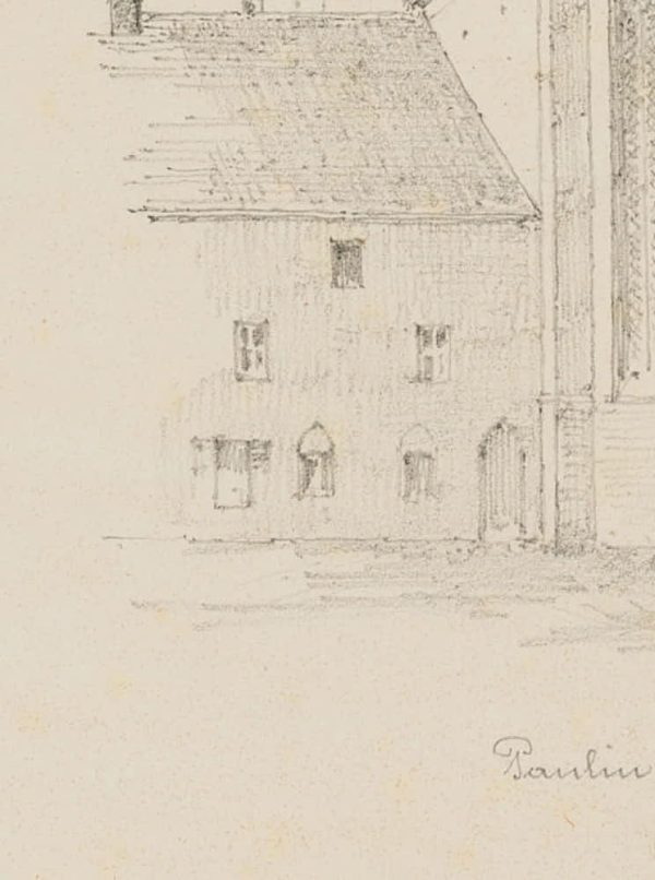- Beschreibung: Gelungene Ansicht einer gotischen Kirche mit hohem Chor und einem schlanken Westturm. Die dicht angrenzenden Bauten lassen an Klostergebäude denken. Trotz der genauen Bezeichnung mit dem Patrozinium des St. Paulin oder St. Paulinus, lässt sich die Kirche nicht genau verorten. Der über den Dachfirst hinausragende freistehende Giebel erinnert an die Backsteingotik Norddeutschlands. Die Zeichnung stammt aus dem Skizzenbuch eines anonymen reisenden Künstlers aus dem späten 19. Jahrhundert.