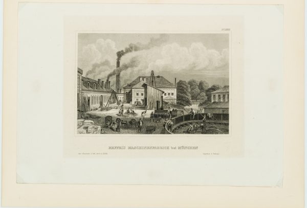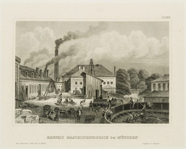 - Description: without designation, titled “Maffei’s Maschinenfabrik bei München”. View of the inner courtyard of the J.A. Maffei locomotive and machine factory, in Hirschau near Munich. Numerous workers are going about their work, some can be seen, for example, making a locomotive. A man in the foreground seems to be supervising the workers, he could be the owner of the company. The adjacent factory buildings can be seen in the background, smoke is rising from the factory towers.