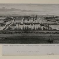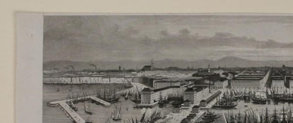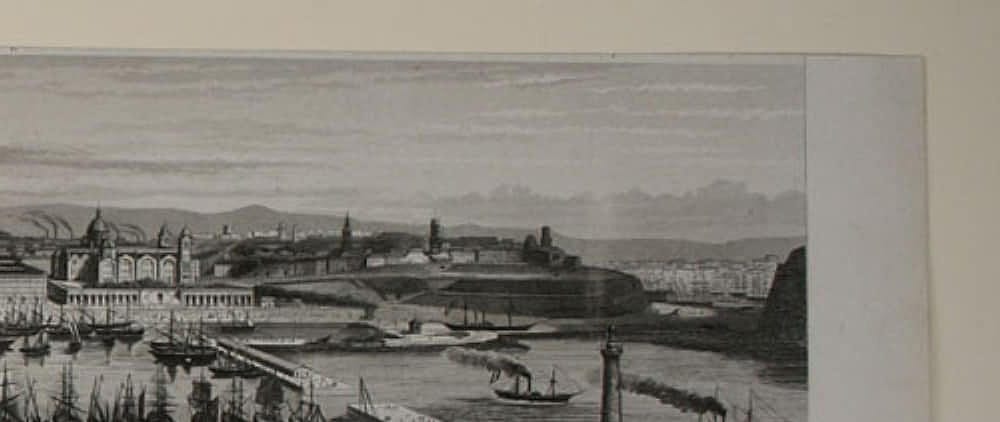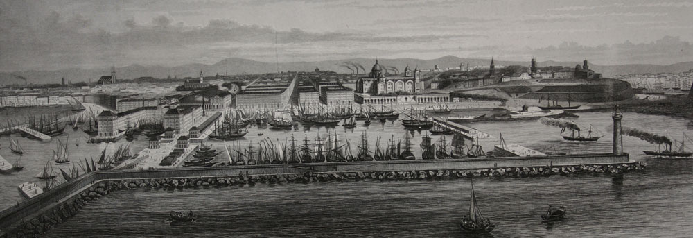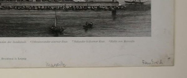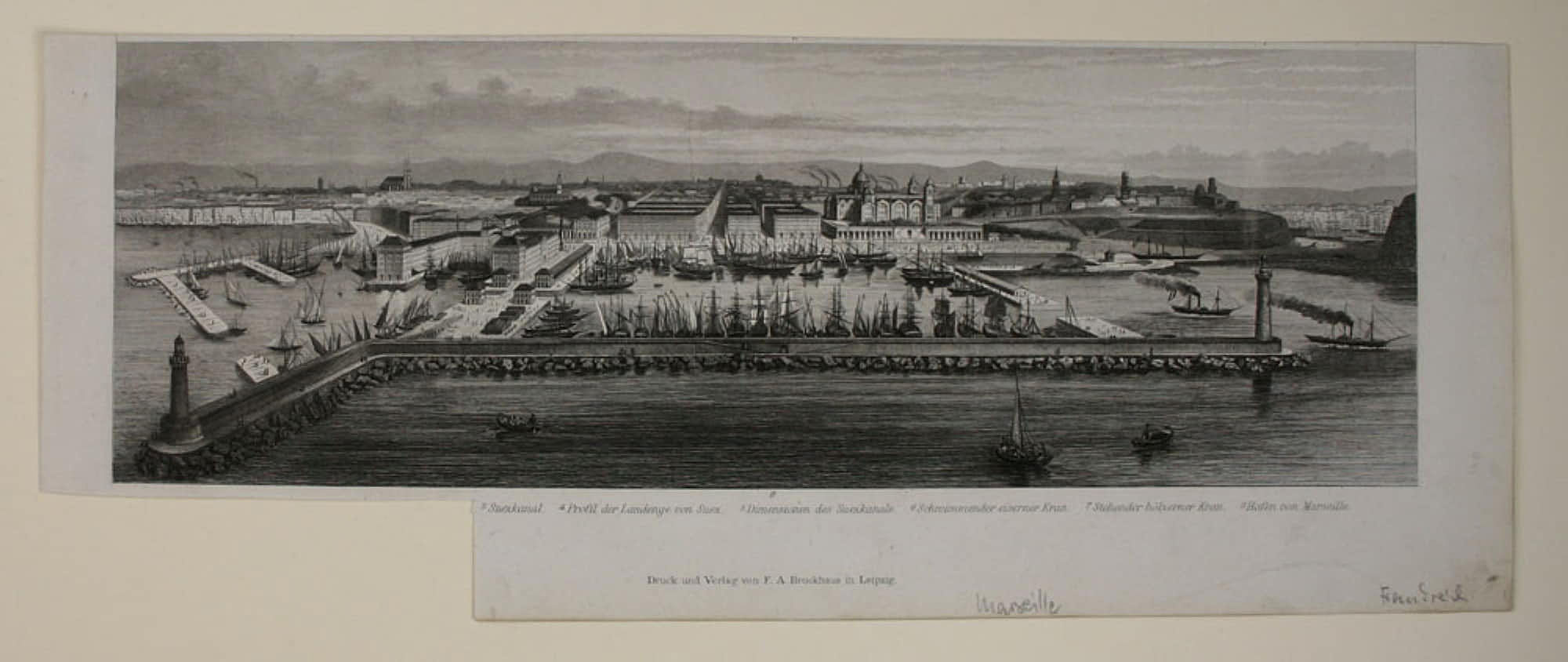 - Description: Steel engraving by an anonymous artist, numbered in the center: “8”, below : ” [.] 8 Port of Marseille Printed and published by F. A. Brockhaus in Leipzig”. Impressive view of Marseilles harbor seen from the sea. Mighty sailing ships lie in the protection of the quay wall, just now two steamships leave the harbor. In the background, the city spreads out with its church spires and high chimneys.