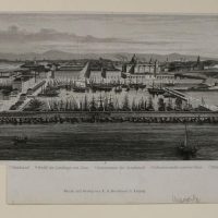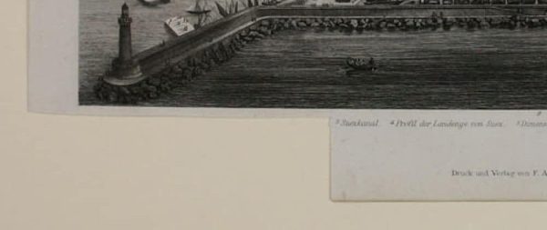 - Beschreibung: Stahlstich eines anonymen Künstlers, nummeriert mittig: “8”, darunter : ” [.] 8 Hafen von Marseille Druck und Verlag von F. A. Brockhaus in Leipzig”. Eindrucksvolle Ansicht des Marseiller Hafens vom Meer aus gesehen. Mächtige Segelschiffe liegen im Schutz der Kaimauer, soeben verlassen zwei Dampfschiffe den Hafen. Im Hintergrund breitet sich die Stadt mit ihren Kirchtürmen und hohen Schornsteinen aus.