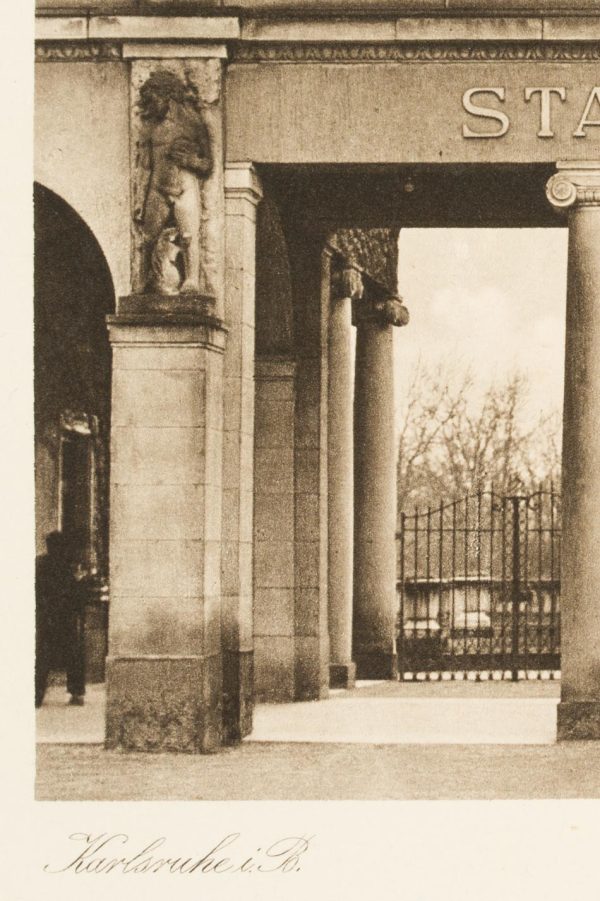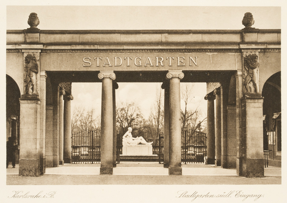 - Inscription: Inscribed below the image in the printing plate with “Karlsruhe i.B.” and “Stadtgarten südl. Eingang”.