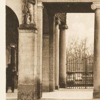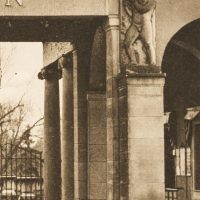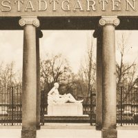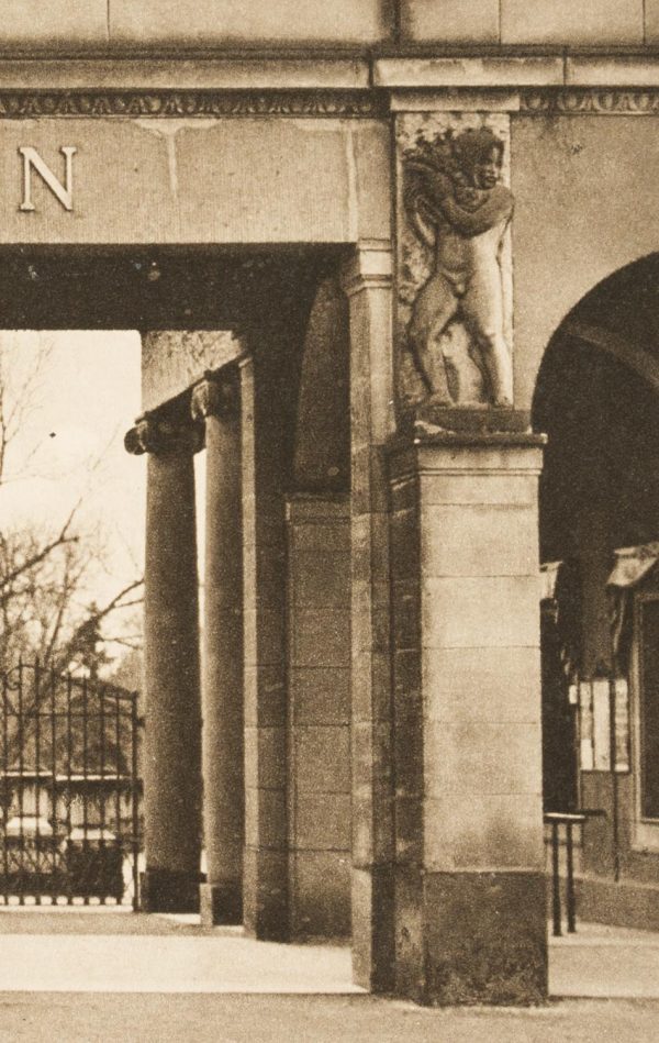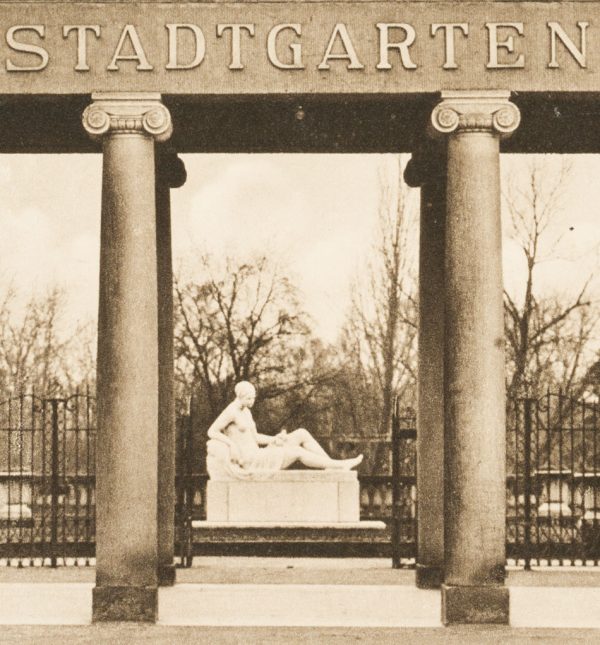 - Description: View of the southern entrance to the Stadtgarten and zoological garden in Karlsruhe. A seated sculpture of a female nude can be seen through the Ionic columns of the neo-classical portal hall.