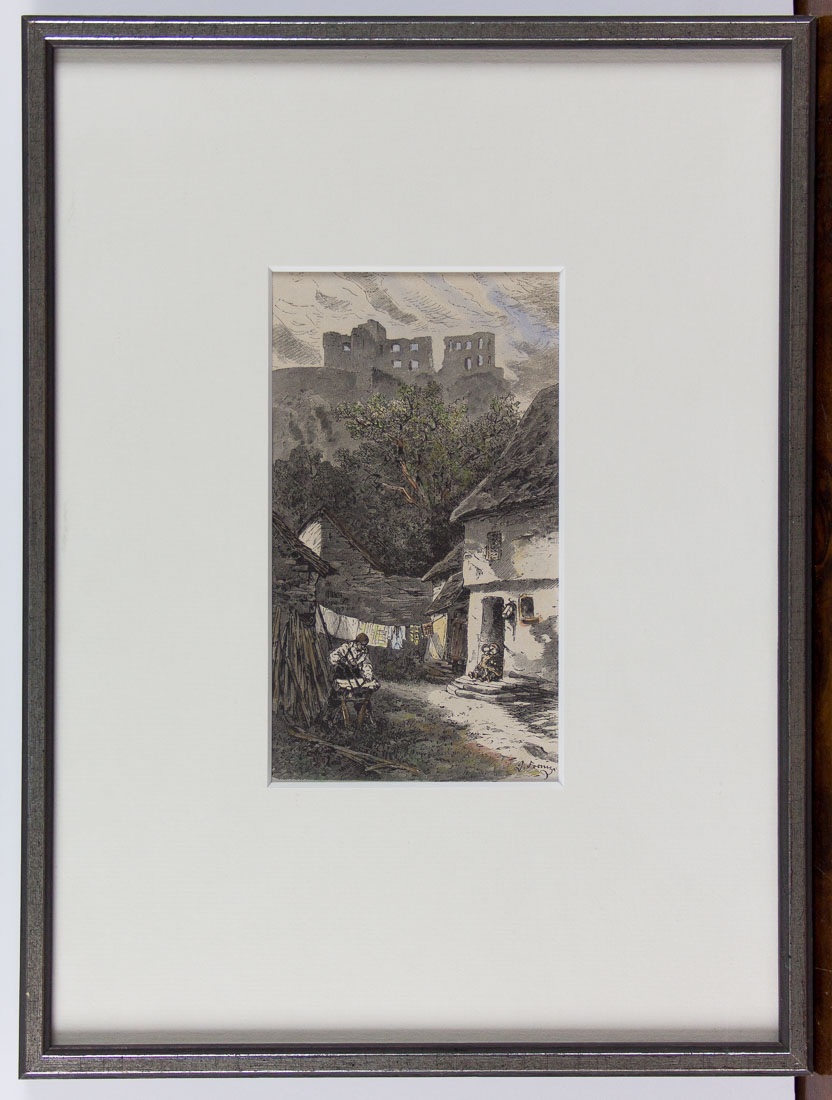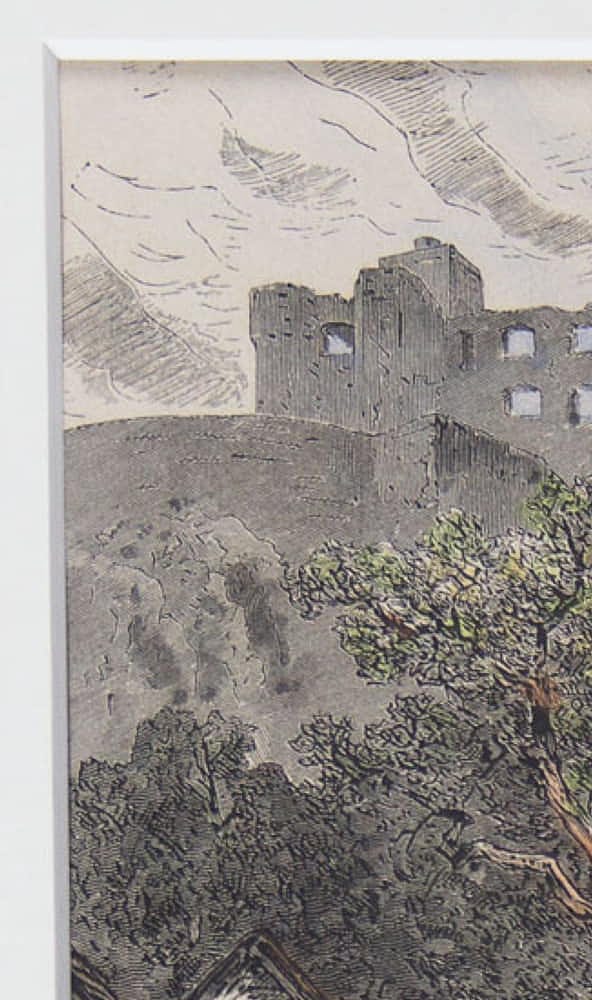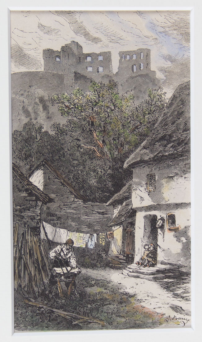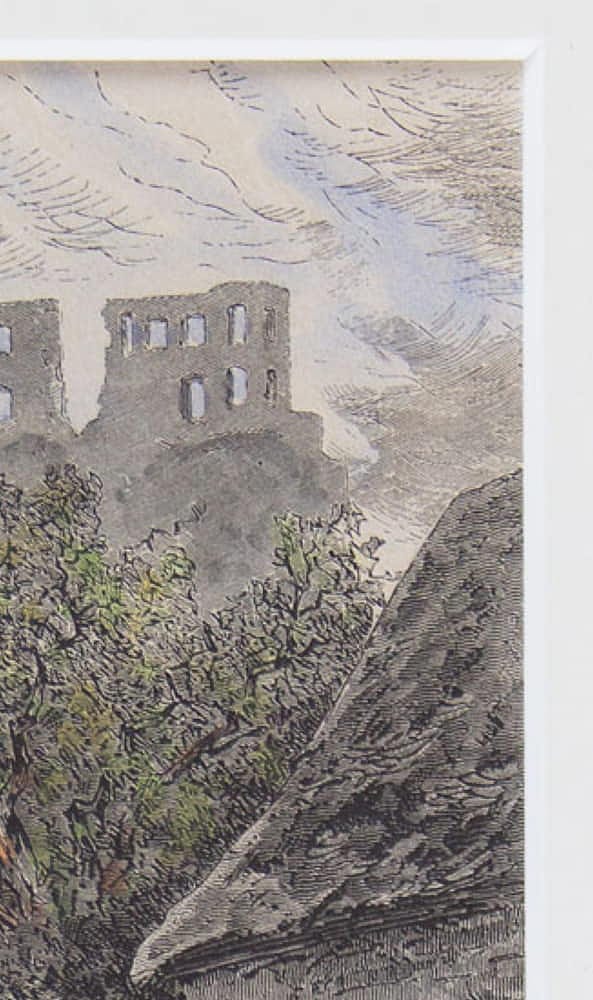 Original coloured wood engraving with a view of a castle ruin.