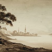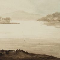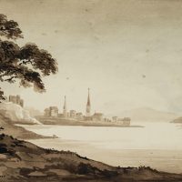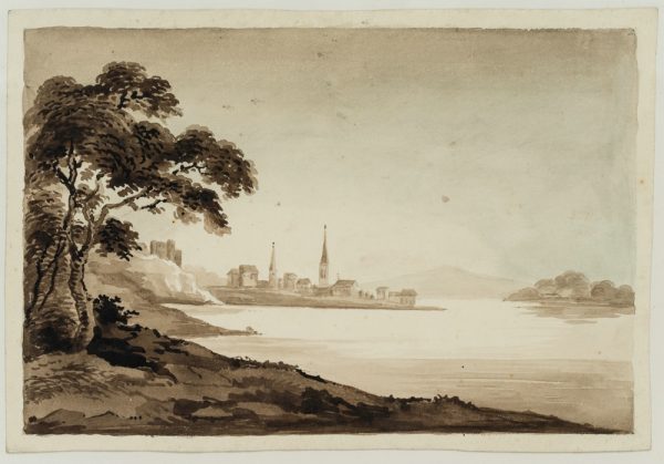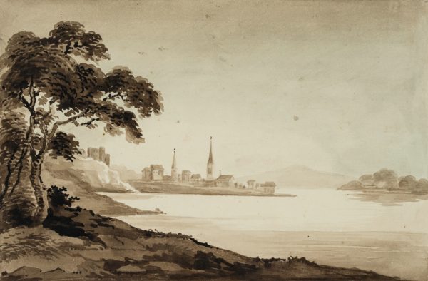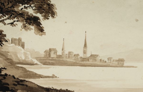 - Description: Monochrome landscape sketch by an anonymous artist who probably travelled in Britain in the late 19th century. From the shore of a large lake in northern England, Wales or Scotland, the artist looks down on a small village with two high church towers and the walls of a castle, situated on a piece of land that stretches far into the lake.