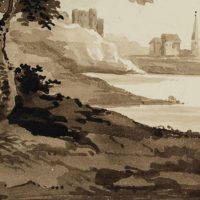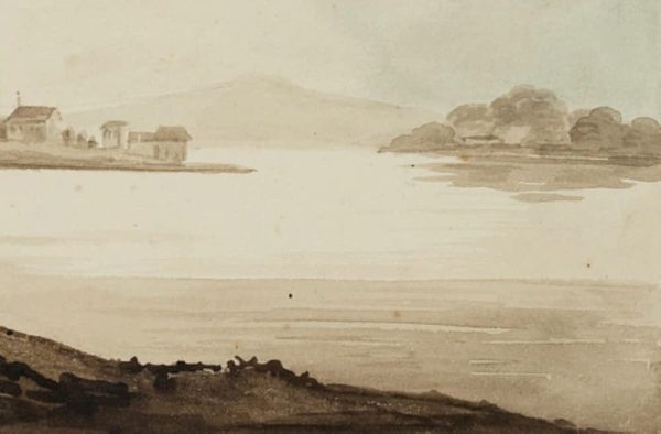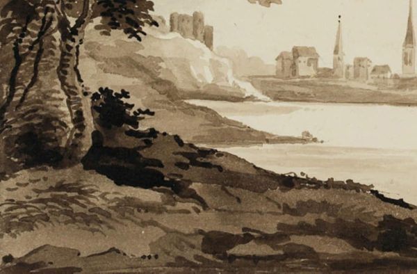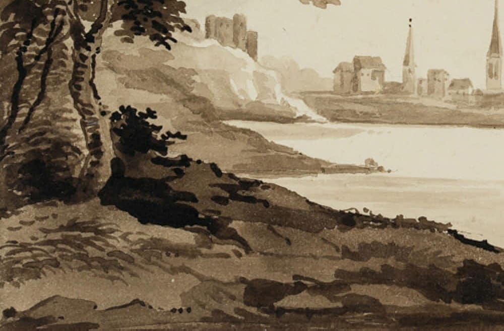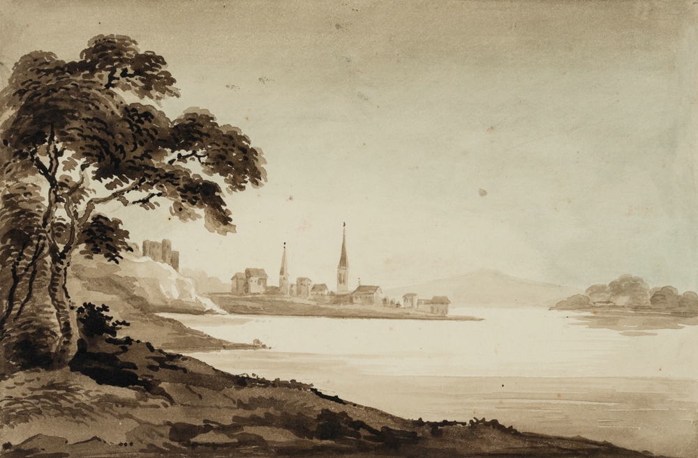- Beschreibung: Monochrome Landschaftskizze eines anonymen Künstlers, der vermutlich im späten 19. Jahrhundert in Großbritannien gereist ist. Vom Ufer eines großen Sees in Nordengland, Wales oder Schottland aus blickt der Künstler auf eine kleine Ortschaft mit zwei hohen Kirchtürmen und den Mauern einer Burg, die sich auf einem Stück Land befindet, das sich weit in den See hineinschiebt.