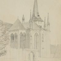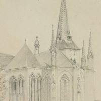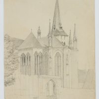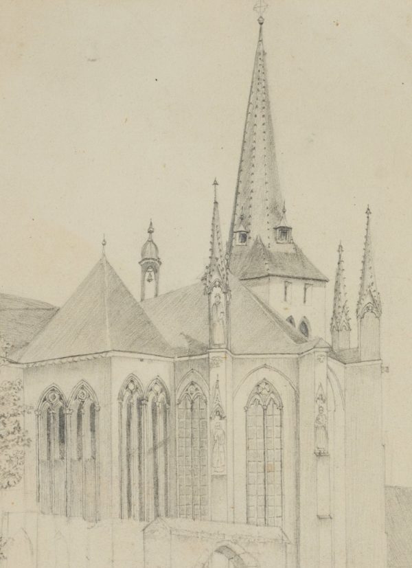 - Description: Finely drawn view of a Gothic abbey or parish church with simple, late Gothic tracery and filigree pinnacles. Possibly Rhineland.