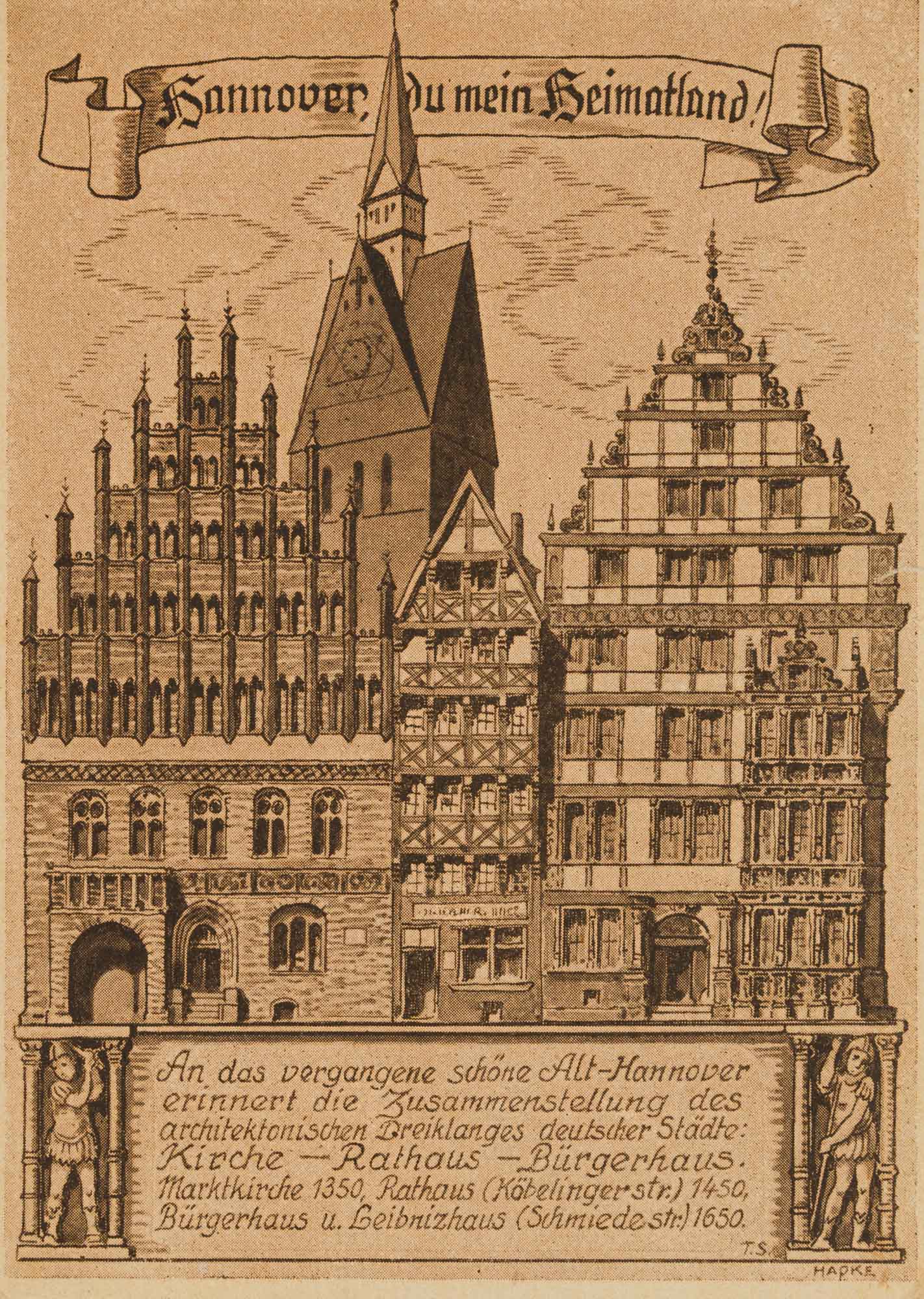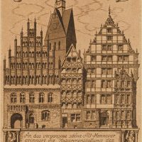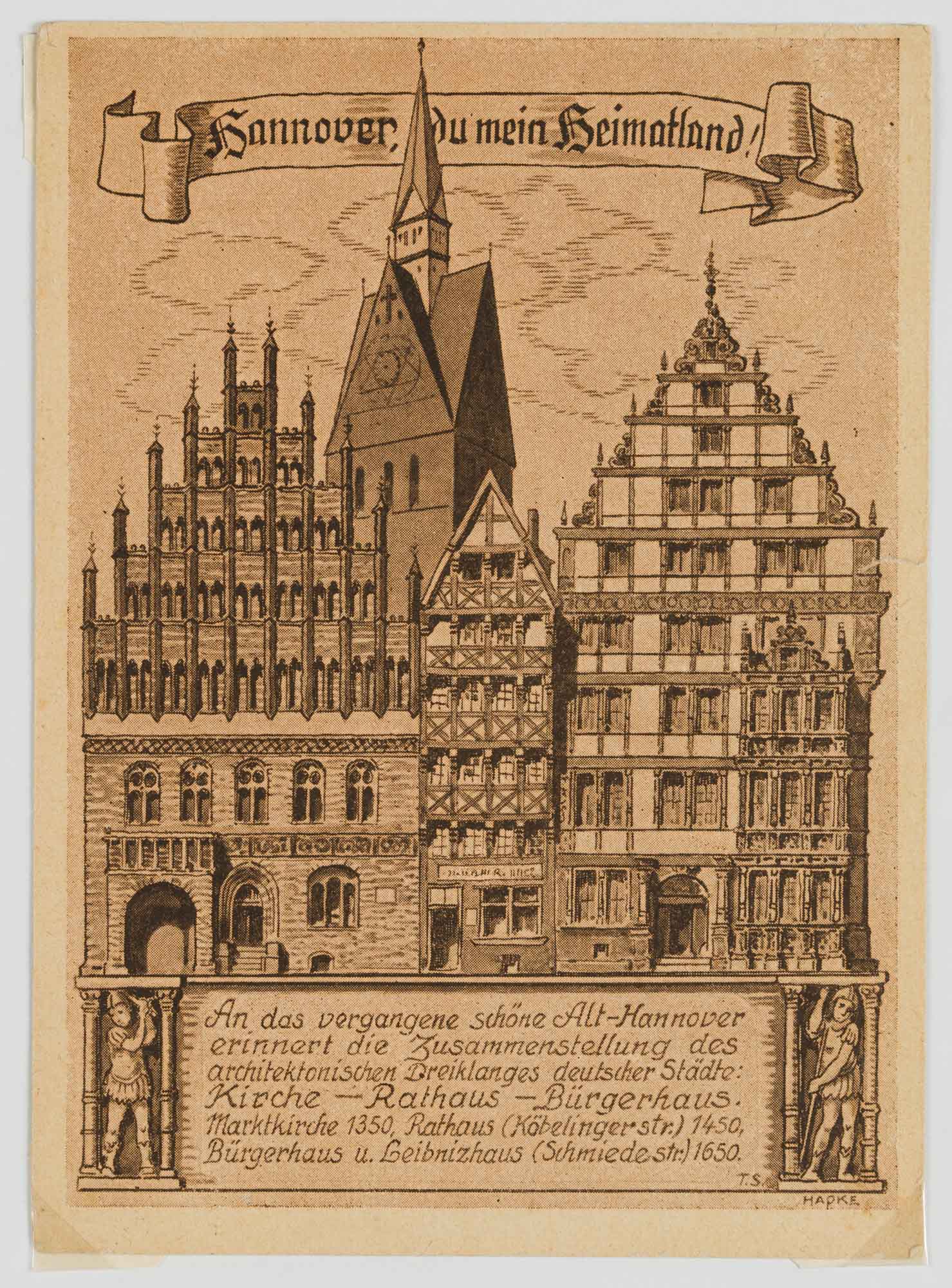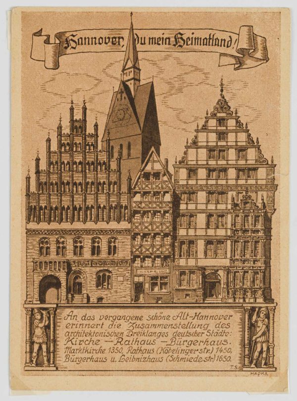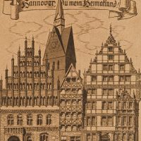Unbekannt (19. Jahrhundert), Postkarte. Ansicht alter Gebäude von Hannover: Marktkirche, Rathaus, Bürgerhaus, ‘Hannover, du mein Heimatland! An das vergangene schöne Alt-Hannover’, 19. Jahrhundert, Reproduktion