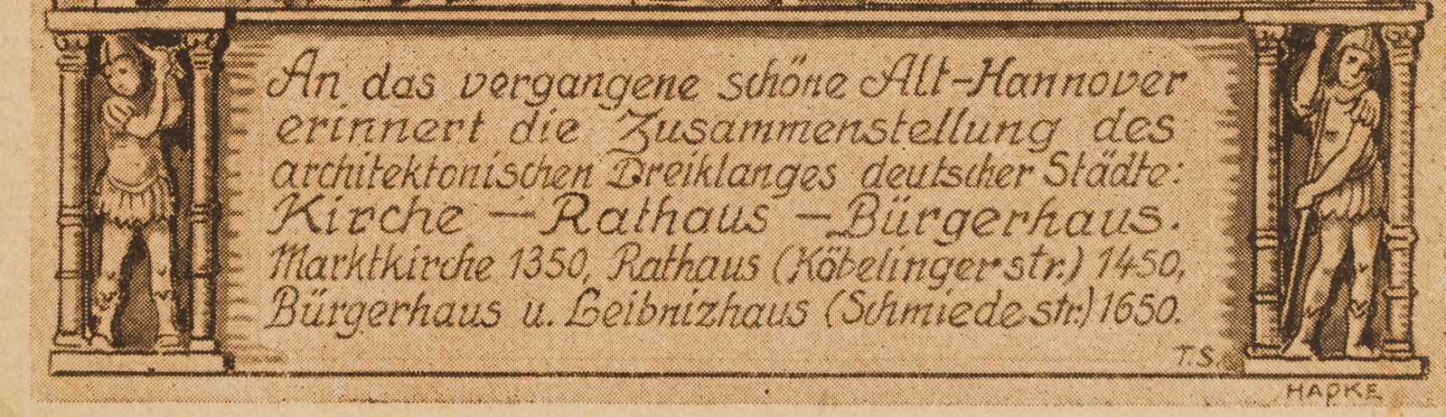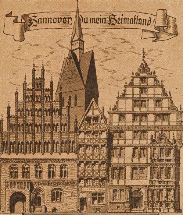 Unknown (19. Jahrhundert), Postcard View of old buildings of Hannover: Market Church, Town Hall, Bürgerhaus, ‘Hannover, du mein Heimatland! To the past beautiful old Hanover’, 19th century, Reproduction