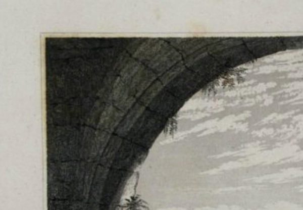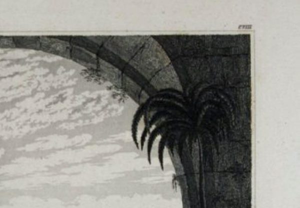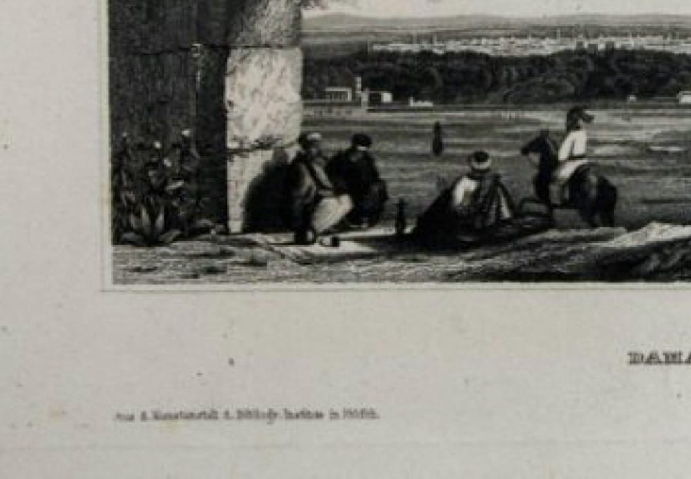 - Beschreibung: Stahlstich eines anonymen deutschen Künstlers, bezeichnet oben: “CVIII”, unten: “Damaskus Aus d. Kunstanst. d. Bibliogr. Instituts in Hildbgh. Eigenthum d. Verleger”. Ein aus mächtigen Steinquadern errichteter Rundbogen rahmt die Landschaft. Der Betrachter blickt in eine weite Ebene hinab, die hellen Häuser und hohen Minarette von Damaskus sind hinter einem dunklen Wald auszumachen.
