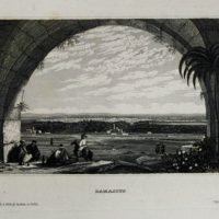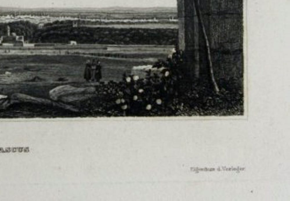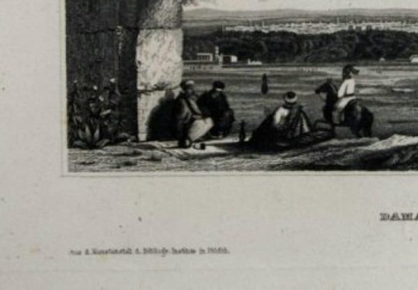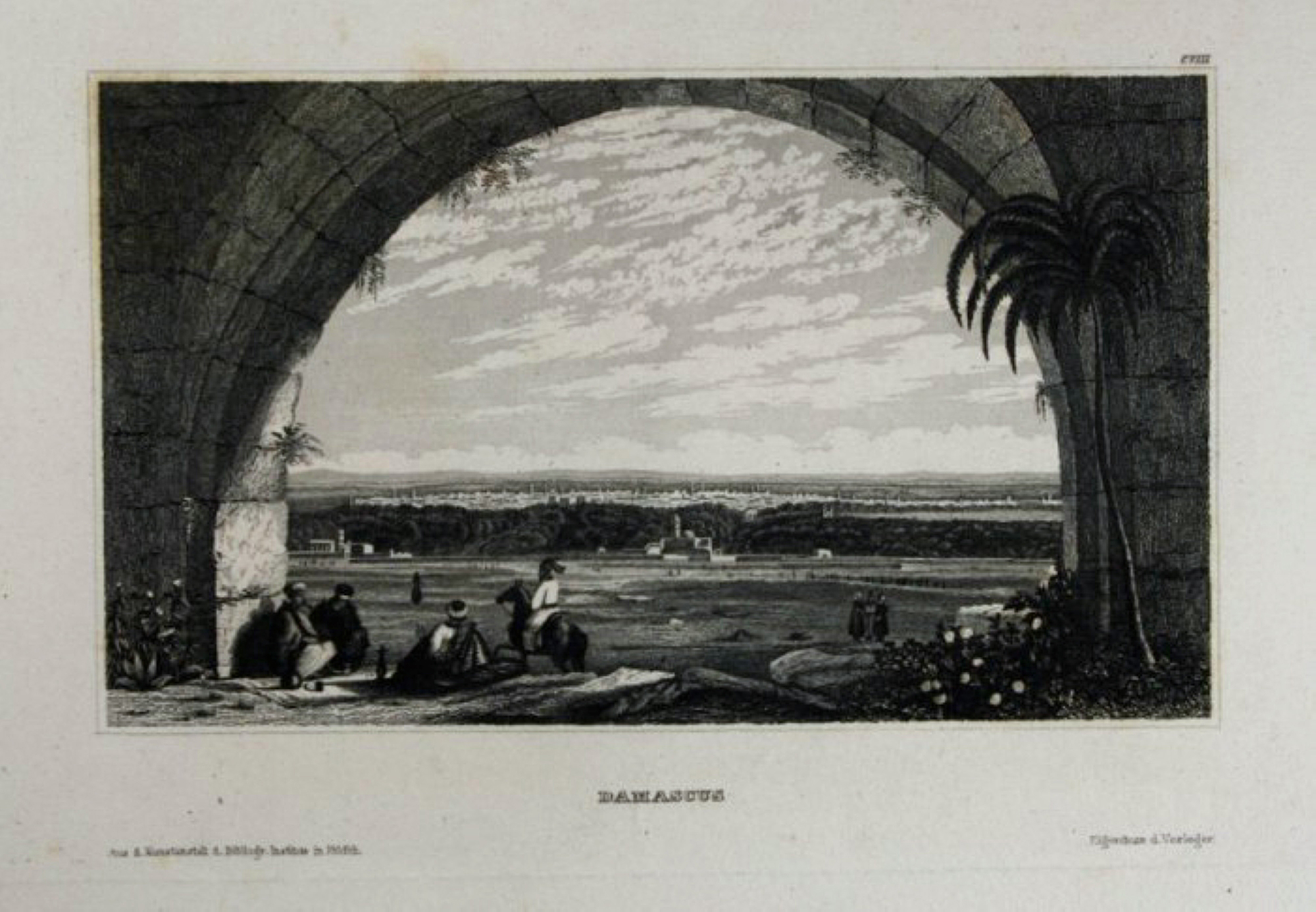 - Description: Steel engraving by an anonymous German artist, inscribed above: “CVIII”, below: “Damaskus Aus d. Kunstanst. d. Bibliogr. Institut in Hildbgh. Property of the publisher”. A round arch made of mighty stone ashlars frames the landscape. The viewer looks down into a wide plain, the bright houses and high minarets of Damascus can be made out behind a dark forest.