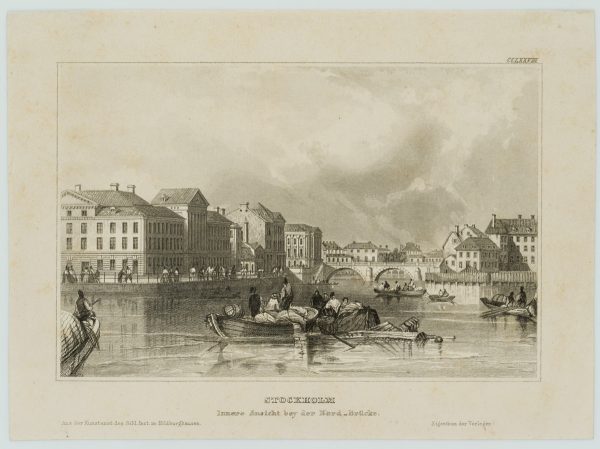- Description: Without inscription, titled “Stockholm/Innere Ansicht bey der Nord-Brücke”. View of Stockholm with city silhouette in the background. In the foreground numerous boats and figures, which are on one of the numerous waterways running through the city. On the shore further figures and groups enlivening the cityscape.