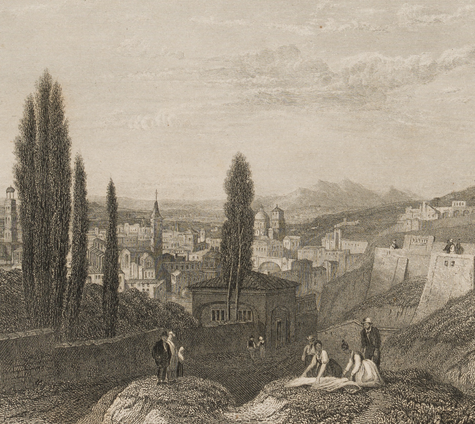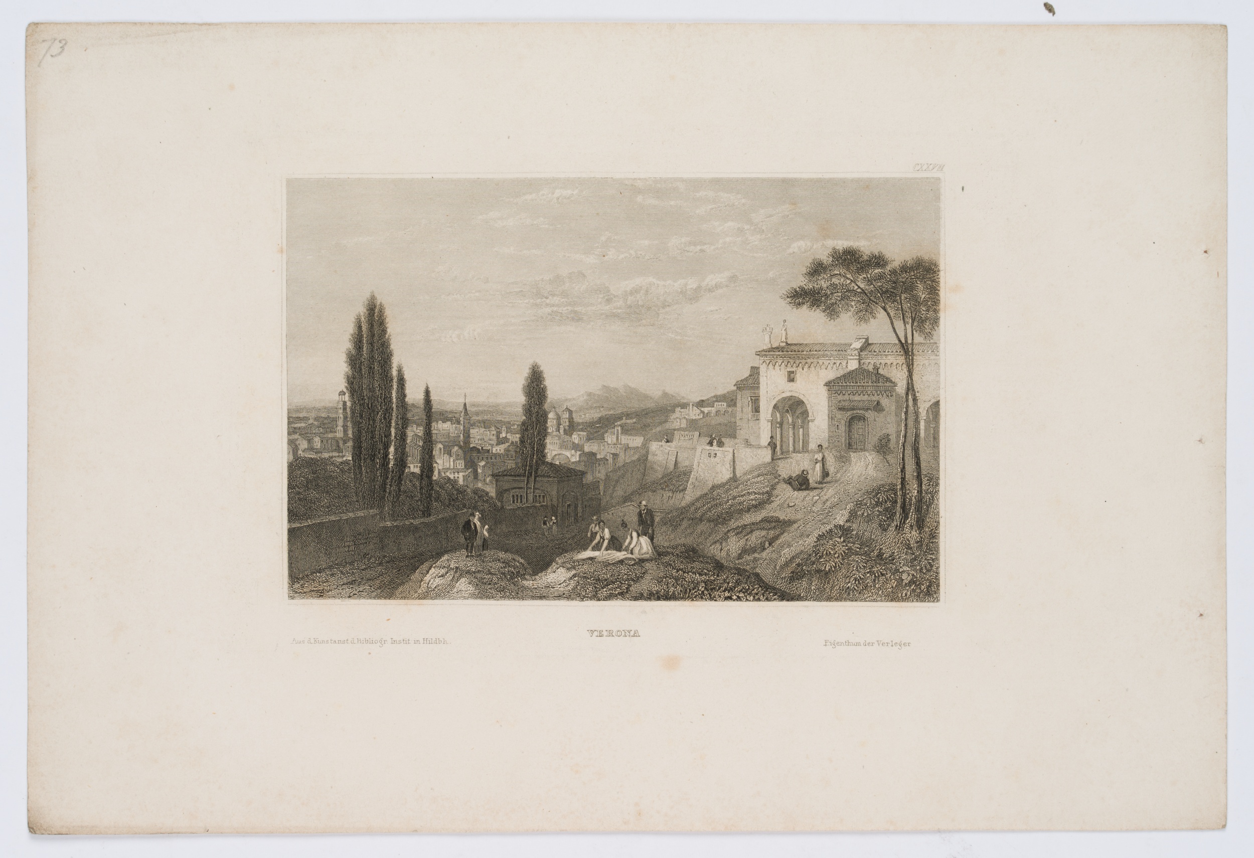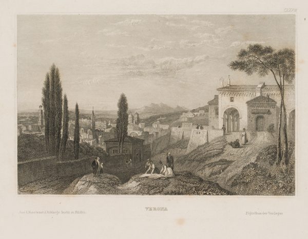 - Description: View of Verona with figures in the foreground. View from the hills.