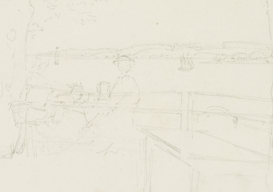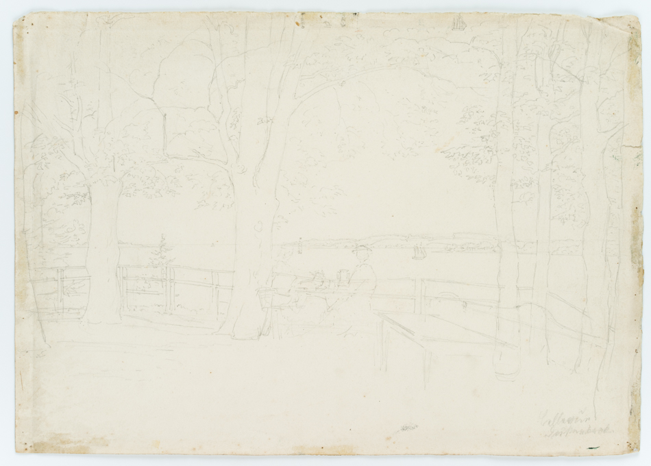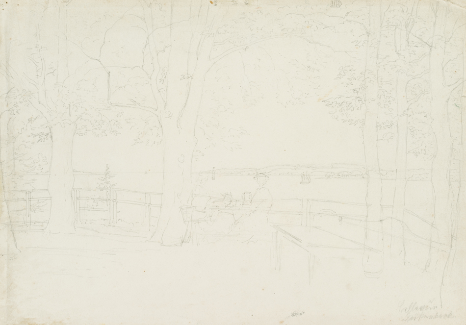 • Description: Successful drawings by an unknown artist. The front shows two sketchily depicted ladies sitting on a promenade under trees on the shore of the Kieler Förde and looking at the water and some passing sailing ships.