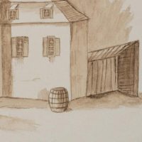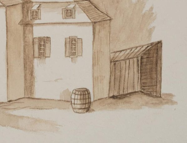 Unbekannt (19. Jahrhundert), Architekturstudie eines Gutshofes von der Vorderseite, um 1872, Pinselzeichnung