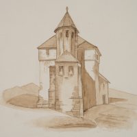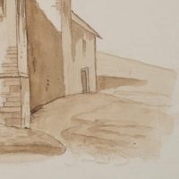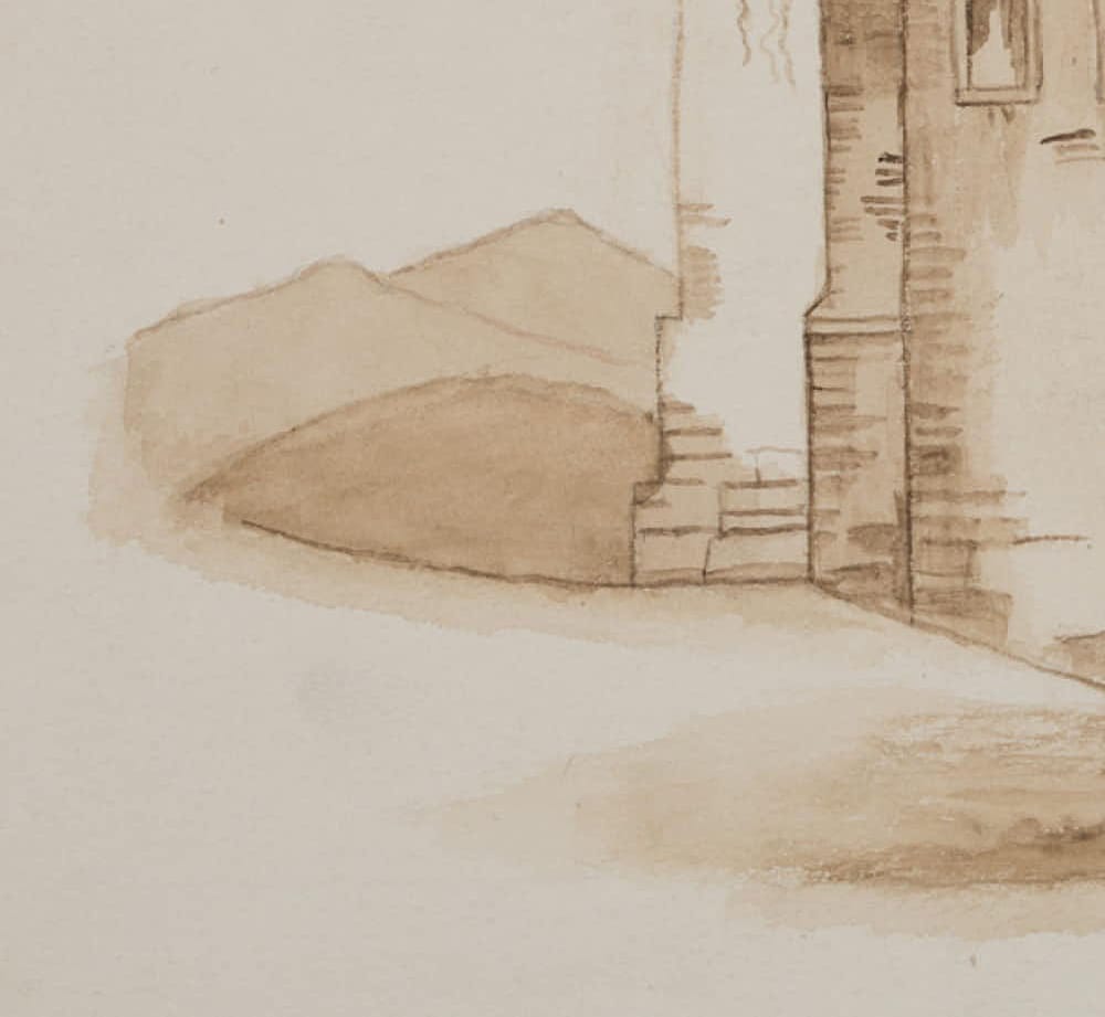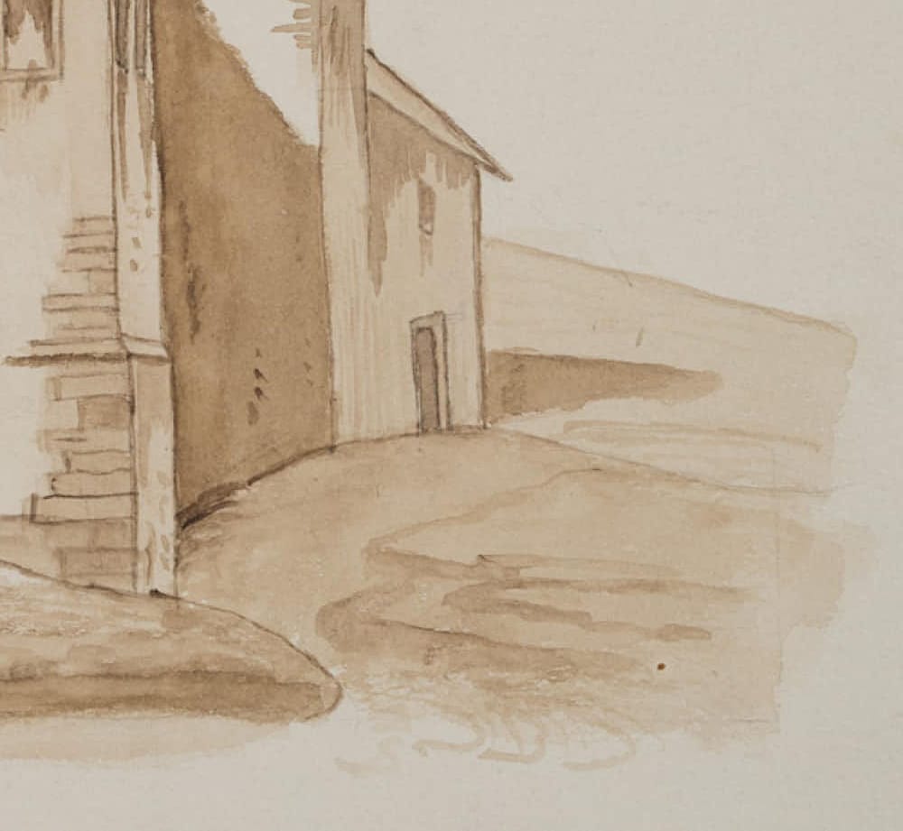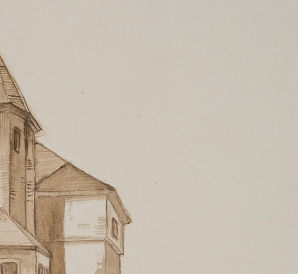 Unbekannt (19. Jahrhundert), Architekturstudie eines Gutshofes von der seitlichen Ansicht, um 1872, Pinselzeichnung