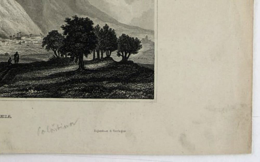 - Inscription: Top left: “M. C. L. N° 1349” Bottom: “Arimathia Aus der Kunstanst. d. Bibl. Inst. in Hildbh.” Property of the publisher”.