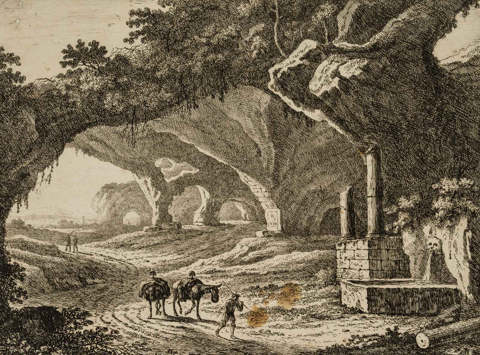 Unknown (19th century), Arcadian landscape with ancient ruin, fountain, donkey driver and wanderer, c. 1800, Etching