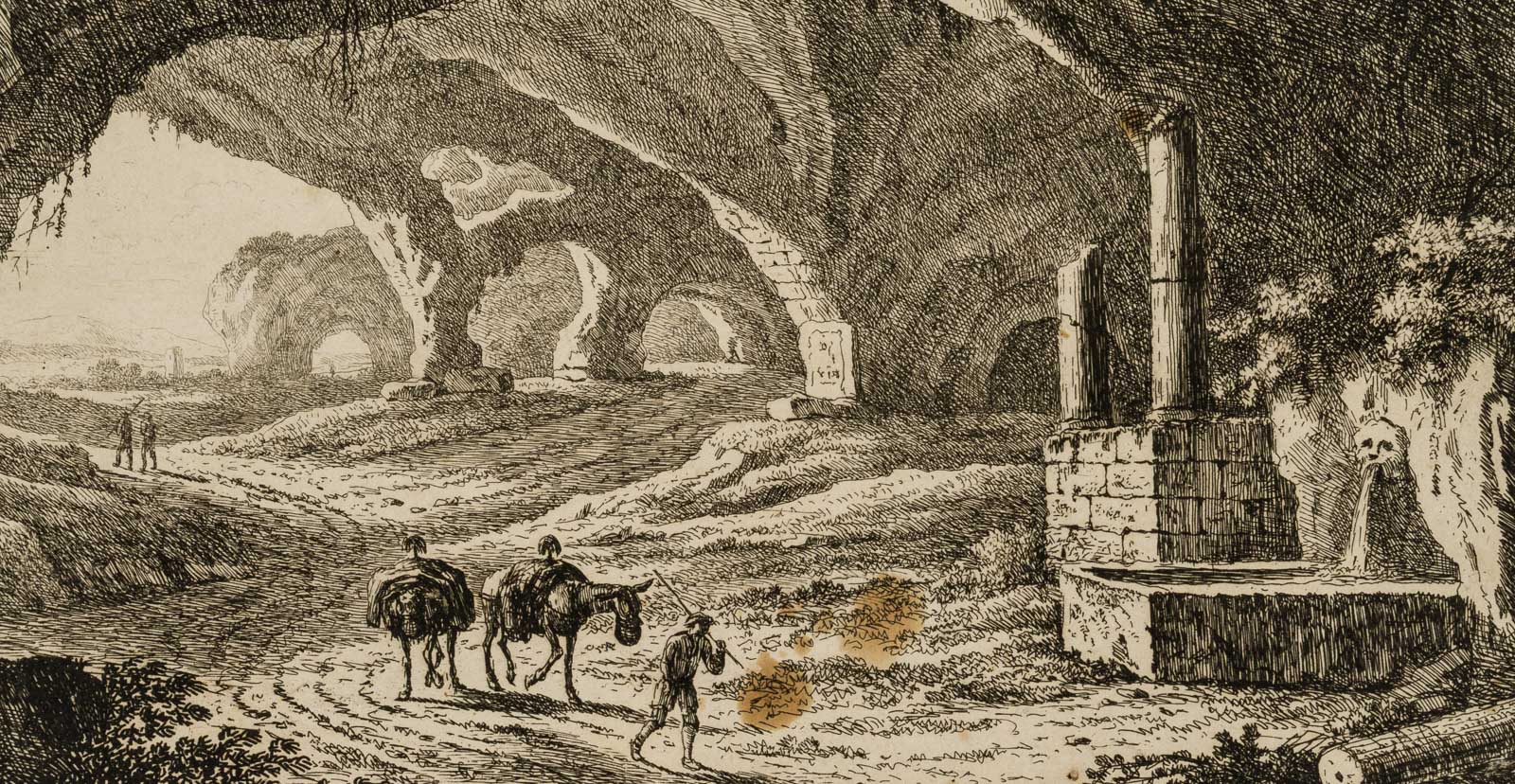 - Description: Italian Arcadian landscape depiction with a hiking trail leading along a cave gorge past an ancient ruin with columns and a well. In the foreground a donkey driver with his pack animals is walking towards the well. In the background two hikers are walking.