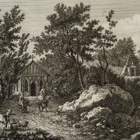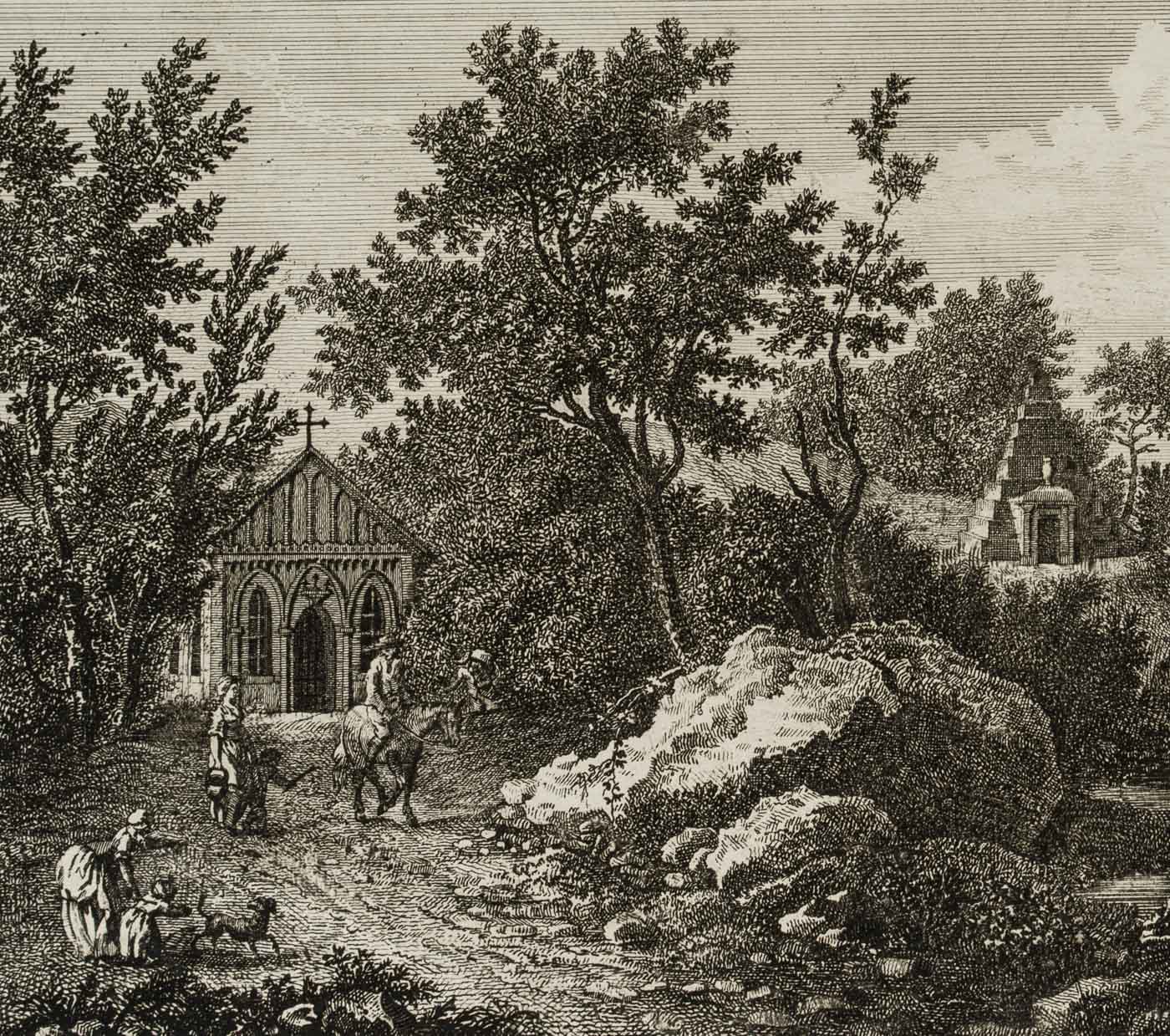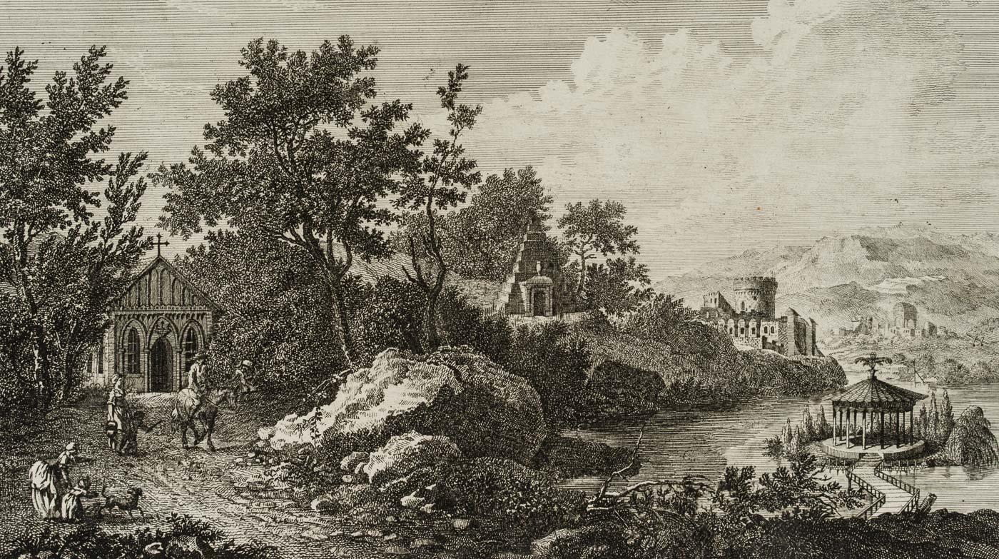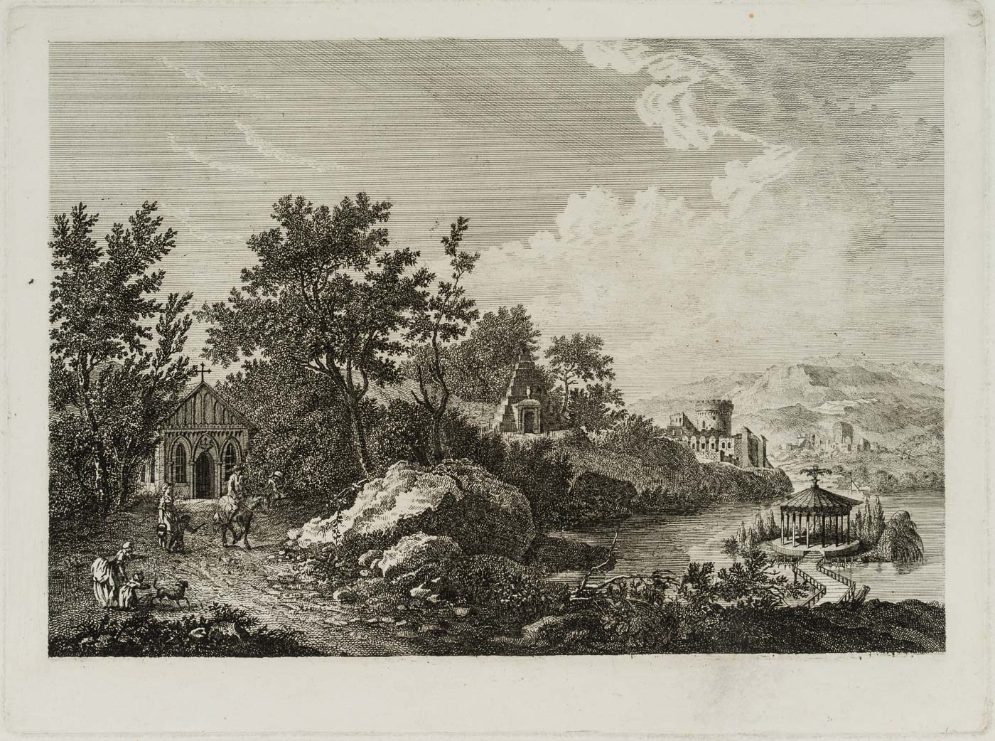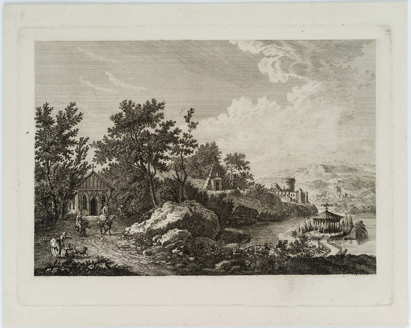 Unknown (19th century), Arcadian landscape with temples and chapels, c. 1800, Etching