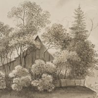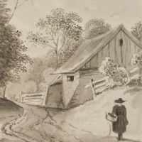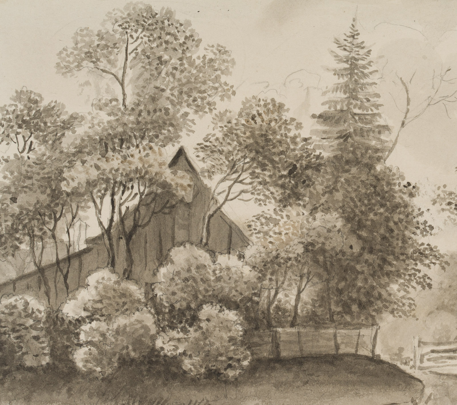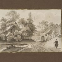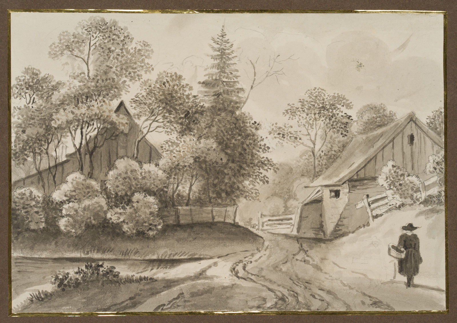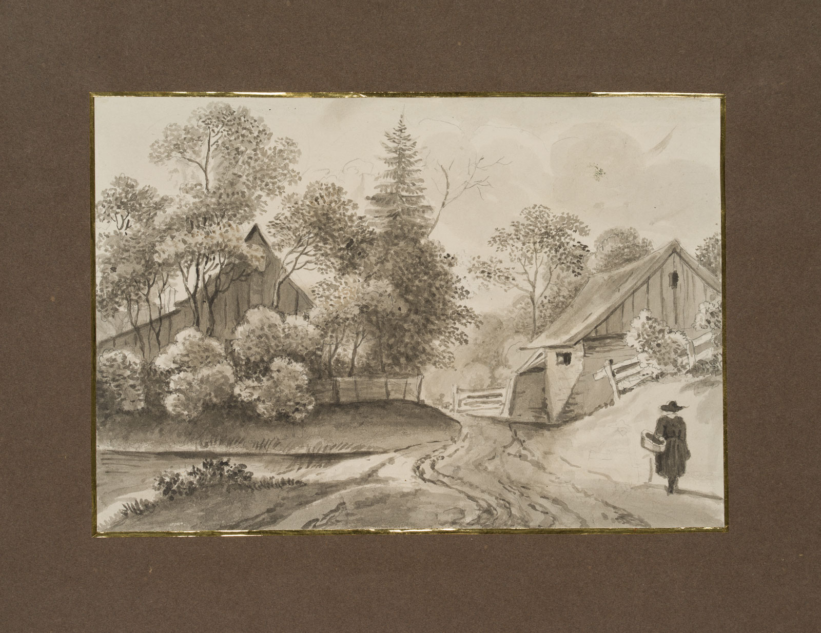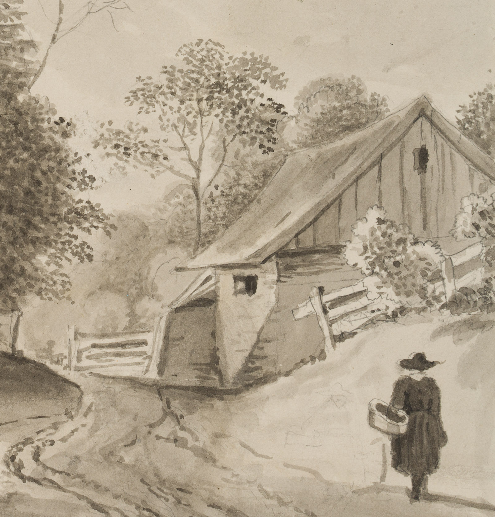 Unbekannt (19. Jahrhundert), Auf dem Feldweg zum Gehöft, Frau mit Korb, um 1860, Pinselzeichnung