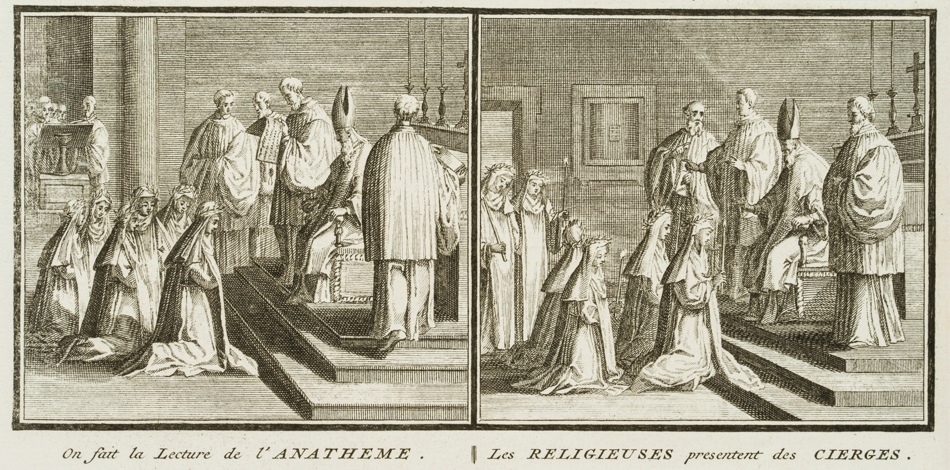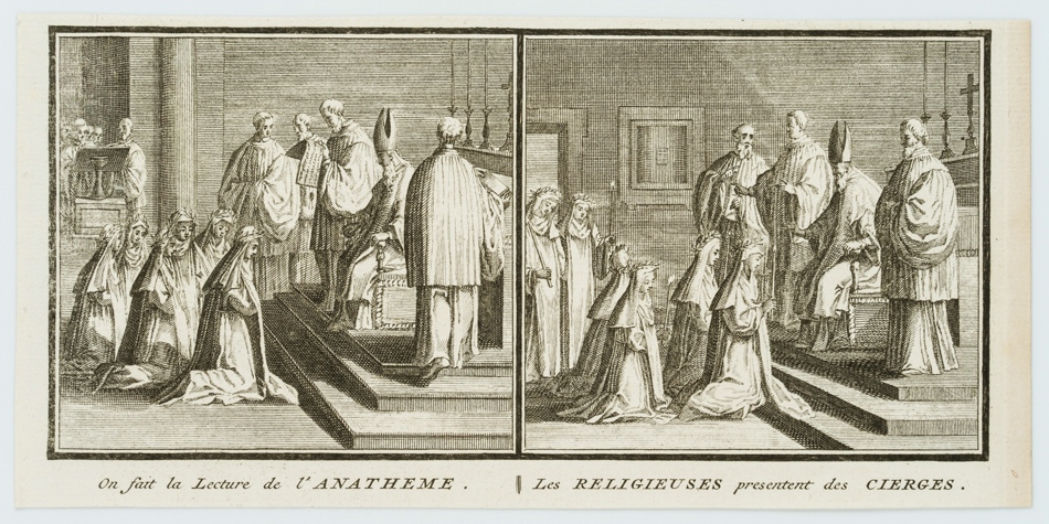 - Bezeichnung: Unten bezeichnet: “On fait la Lecture de l’ANATHEME. II Les RELIGIEUSES present des CIERGES.”