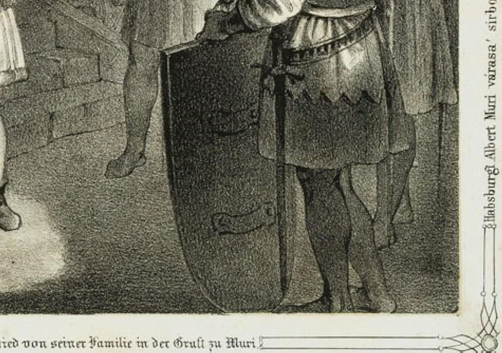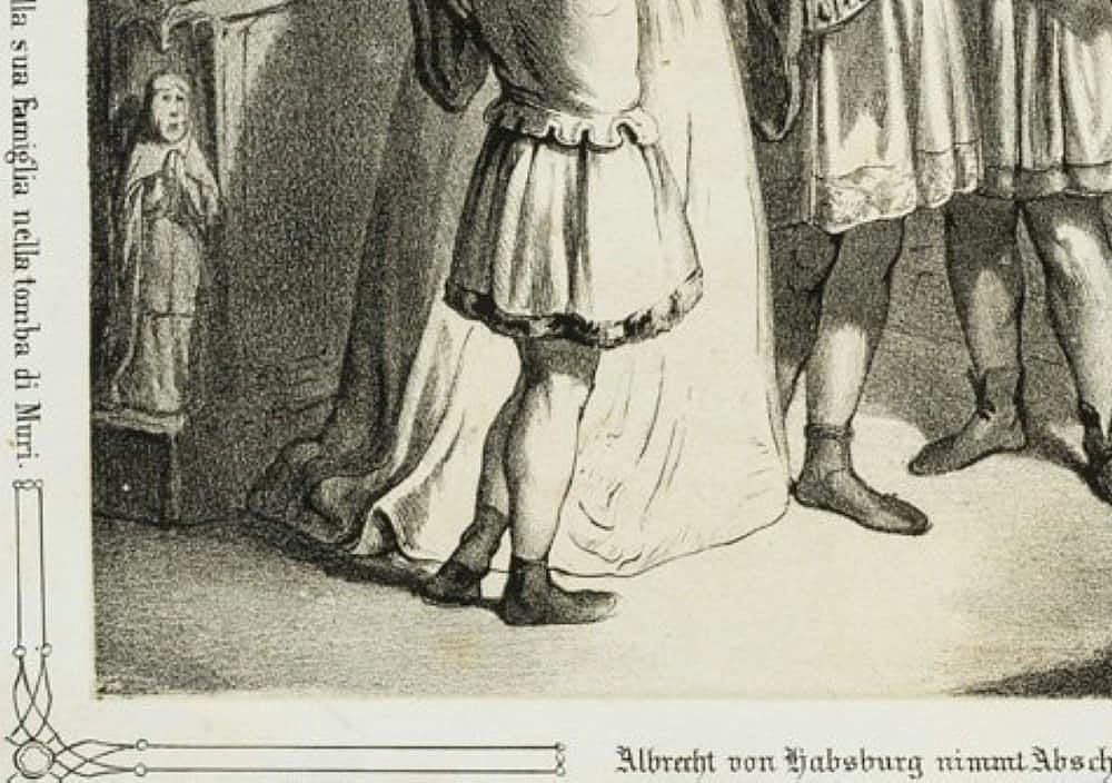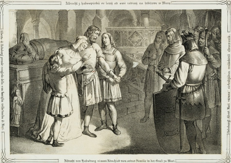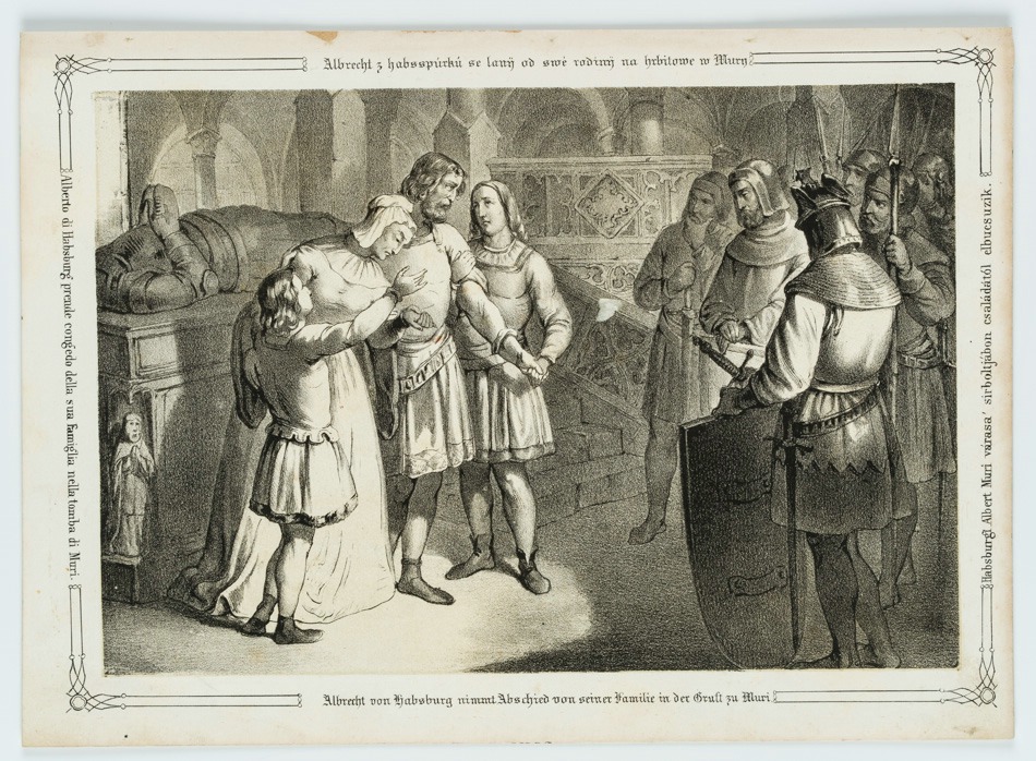 • Bezeichnung: Unten mit dem deutschen Titel “Albrecht von Habsburg nimmt Abschied von seiner Familie in der Gruft zu Muri” bezeichnet.