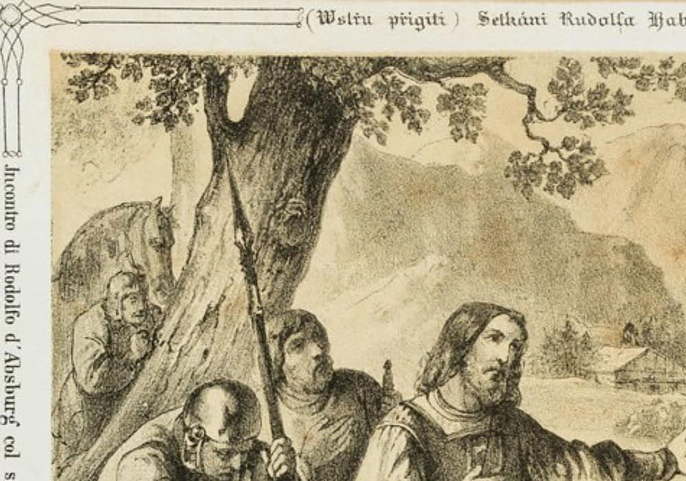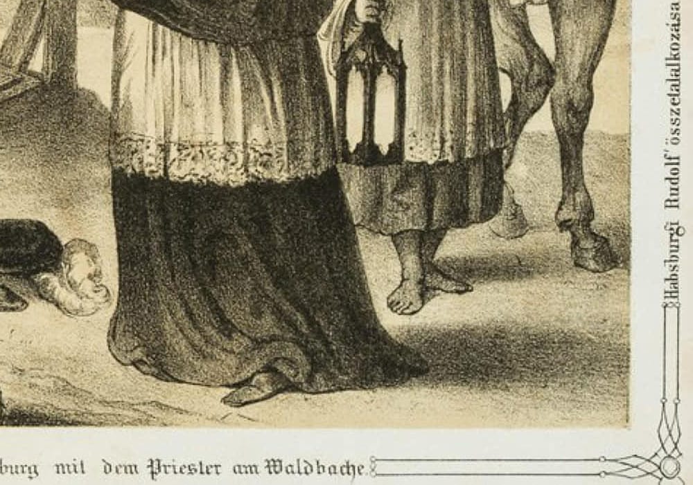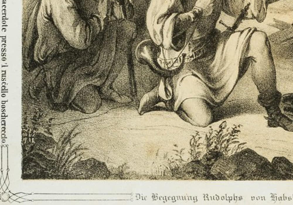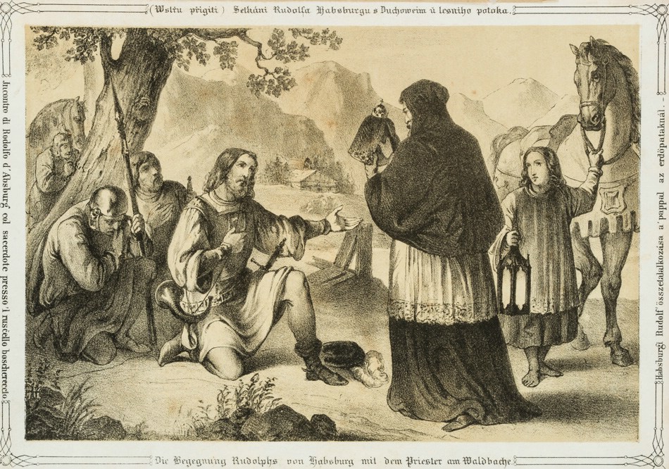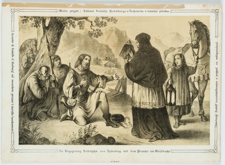 • Inscription: Inscribed below with the German title “Die Begegnung Rudolphs von Habsburgs mit dem Priester am Waldbache”.